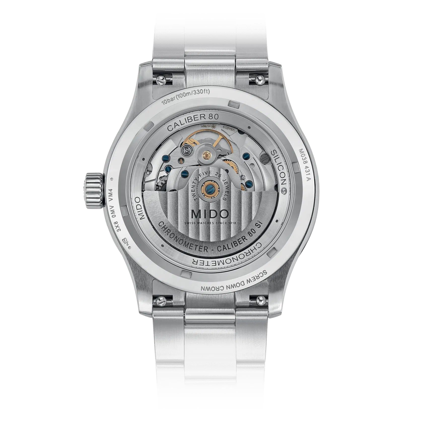 Il movimento MIDO Caliber 80 con cronometro di ultima generazione è dotato di una spirale in silicio. Oltre alle proprietà non amagnetiche, offre una maggior precisione e una resistenza agli urti maggiori. Assicura fino a 80 ore di autonomia.