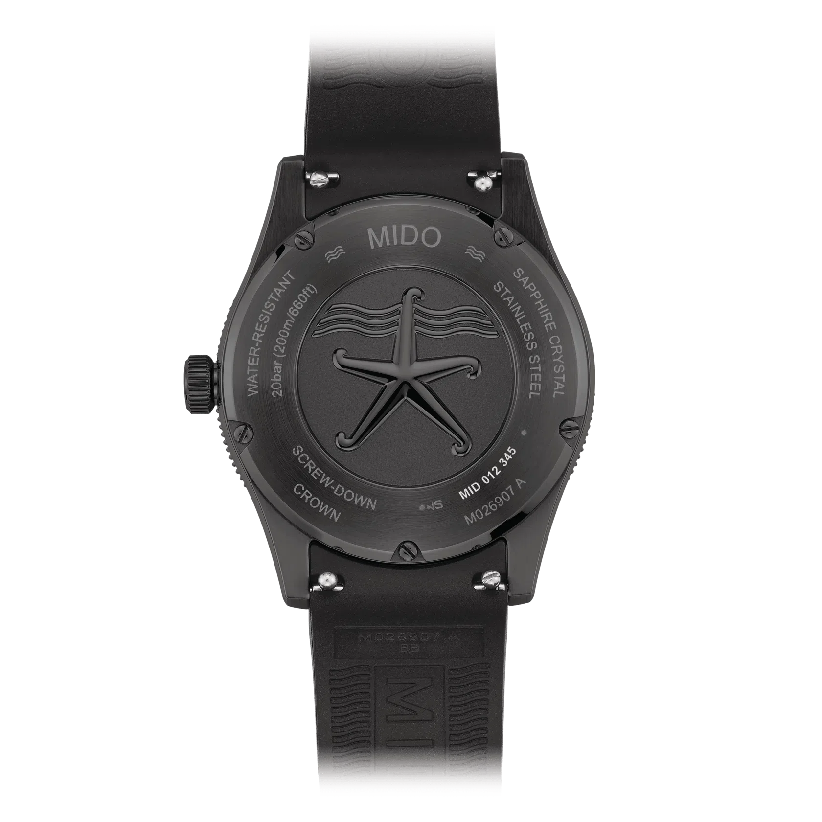 Parti per un’avventura, sulla terraferma o attraverso l’oceano, ma sempre con grande stile! MIDO propone quello che è innegabilmente il suo modello più versatile della linea Ocean Star, un compagno sportivo, affidabile e chic per qualsiasi avventura. Il diametro perfetto di 39 mm è abbinato ad una cassa estremamente sottile per l’Ocean Star. L’estetica di questo orologio automatico è definita anche dal quadrante in rilievo, unico e distintivo, che evoca il movimento delle correnti sulla sabbia. Impermeabile fino a una pressione di 200 m (20 bar / 660 ft), il famoso motivo della stella marina – emblema della storica competenza di MIDO in materia di impermeabilità – è riportato sul fondello a vite.