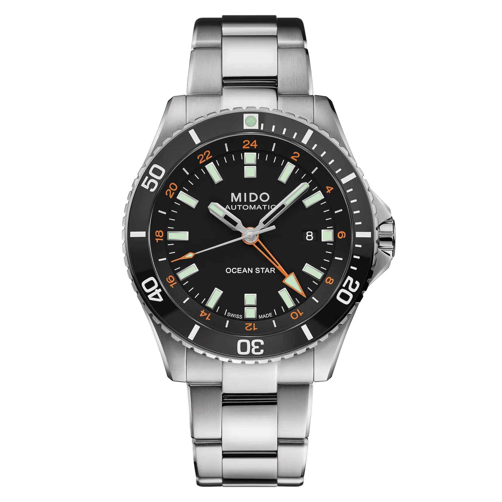 MIDO arricchisce la sua collezione Ocean Star con una versione dotata della funzione GMT molto pratica. Visualizza chiaramente l’ora in due diversi fusi orari: l’ora di casa e l’ora locale. Sul retro dell’orologio – dotato di calibro 80, che offre una riserva di carica fino a 80 ore – MIDO ha inciso le indicazioni del fuso orario. La funzione GMT estremamente facile da usare offre il doppio della libertà per coloro che si trovano nel bel mezzo dell’oceano o di un’avventura adrenalinica.