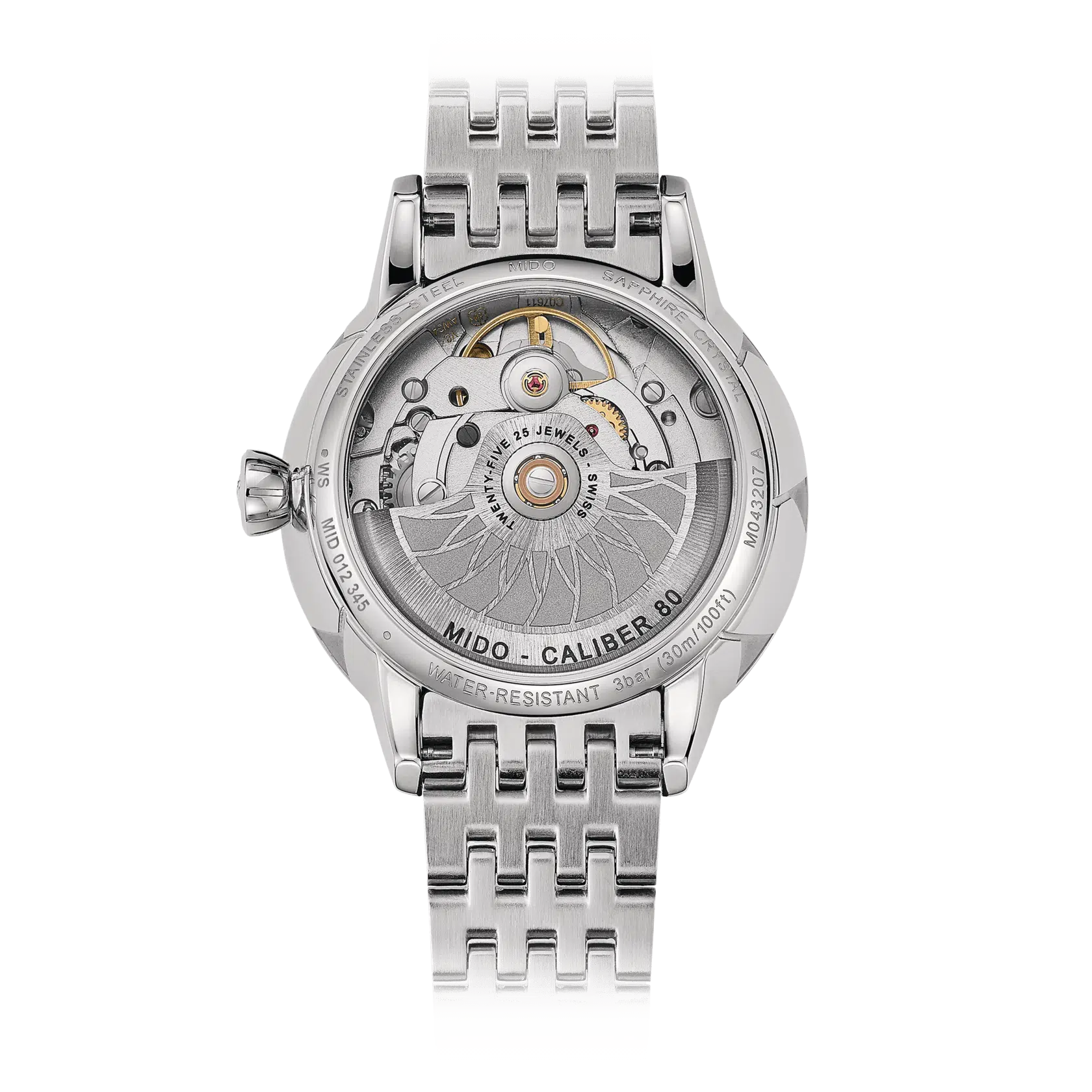 The MIDO Caliber 80 represents a major advance in self-winding movements. Thanks to its new-generation technology, it offers up to 80 hours of power reserve – twice as much as a conventional movement.