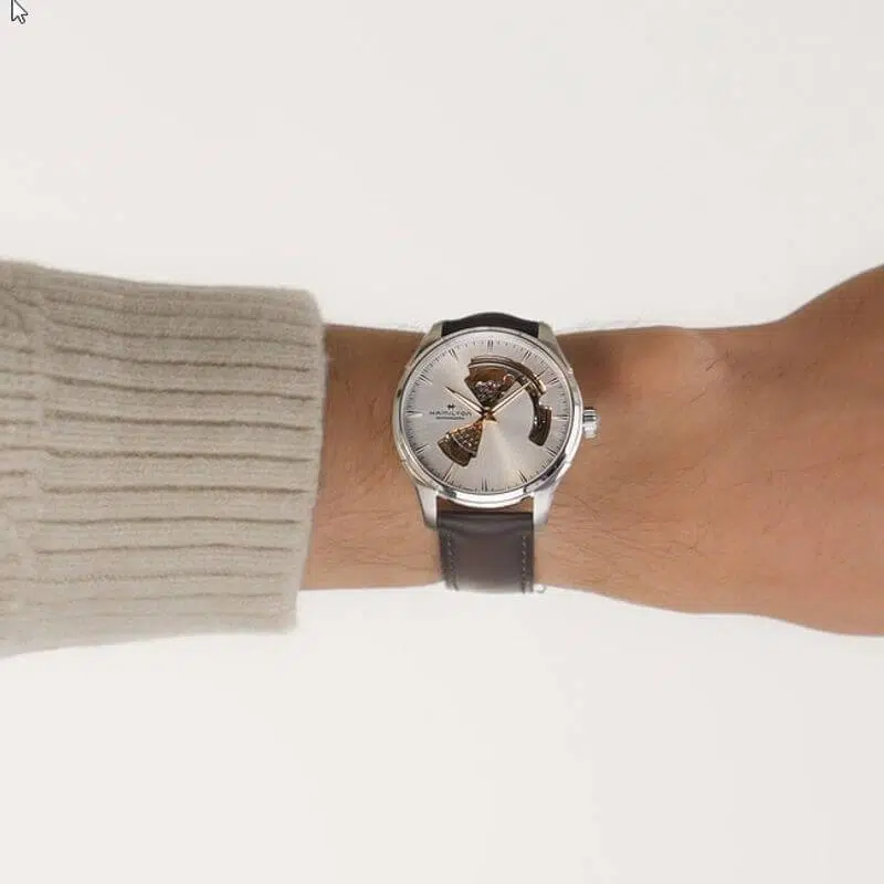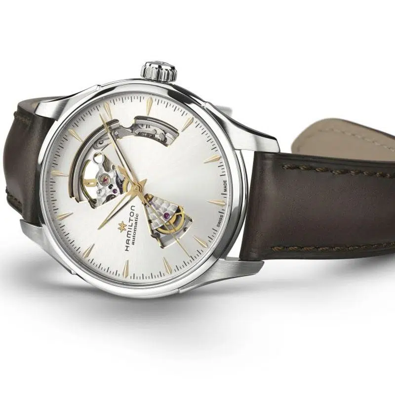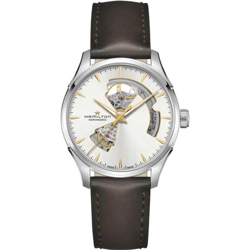 Il Jazzmaster Open Heart 40 mm, con il suo quadrante traforato bianco, punta tutto sulla precisione e rivela al contempo la raffinata bellezza del movimento meccanico al suo interno. Mettendo in risalto il movimento automatico H-10, con una riserva di carica di 80 ore e spirale in Nivachron™, il Jazzmaster Open Heart vanta un sofisticato cinturino in pelle marrone scuro, che incarna il savoir-faire in continua evoluzione di Hamilton e l’attenzione ai dettagli.