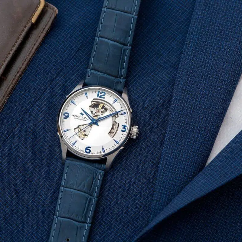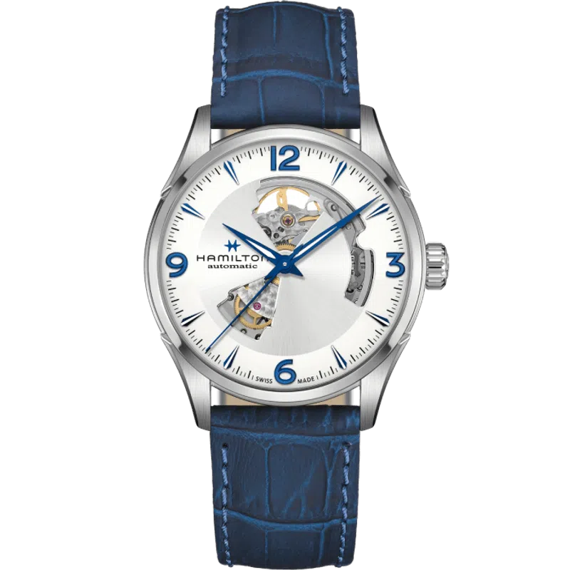 Il Jazzmaster Open Heart da 42 mm è un perfetto connubio di tradizione e innovazione. La scheletratura sul quadrante argento con lancette blu consente di ammirare il movimento automatico Swiss Made Hamilton. Per un look più sofisticato, abbinalo a un cinturino in pelle blu; scegli invece un bracciale in acciaio per uno stile più casual.