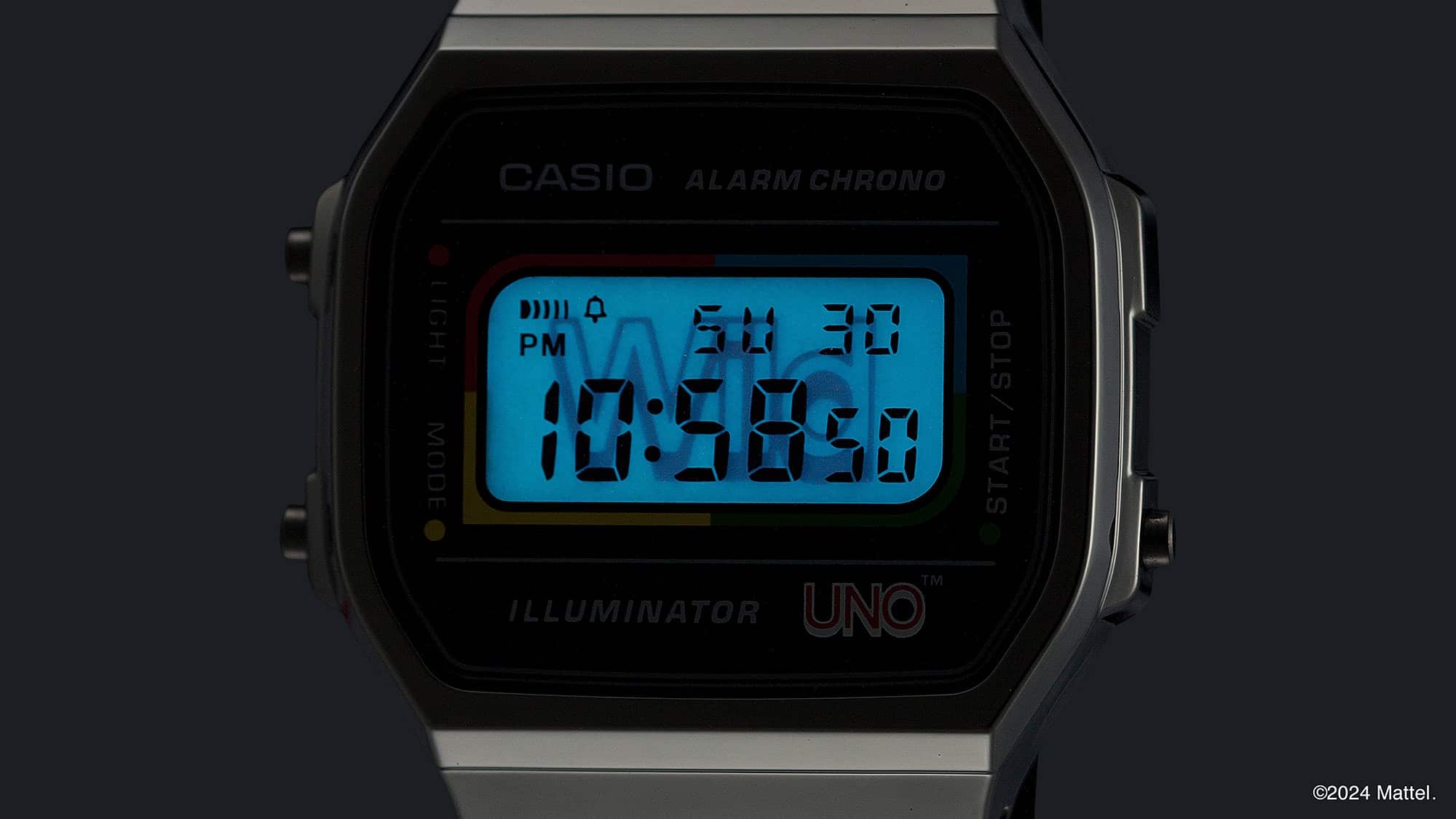 Questa singolare collaborazione inizia con il popolare stile vintage dell’orologio A168 e presenta un motivo UNO™ che rende omaggio al classico design del gioco del 1979. Il quadrante è adornato con i colori dell’onnipotente carta Wild – dando al giocatore la possibilità di scegliere tra rosso, blu, giallo o verde. Attivare la retroilluminazione EL e vedere apparire la scritta “”Wild”” sul display LCD. Il tema classico è ripreso dal logo originale UNO™ sul quadrante.