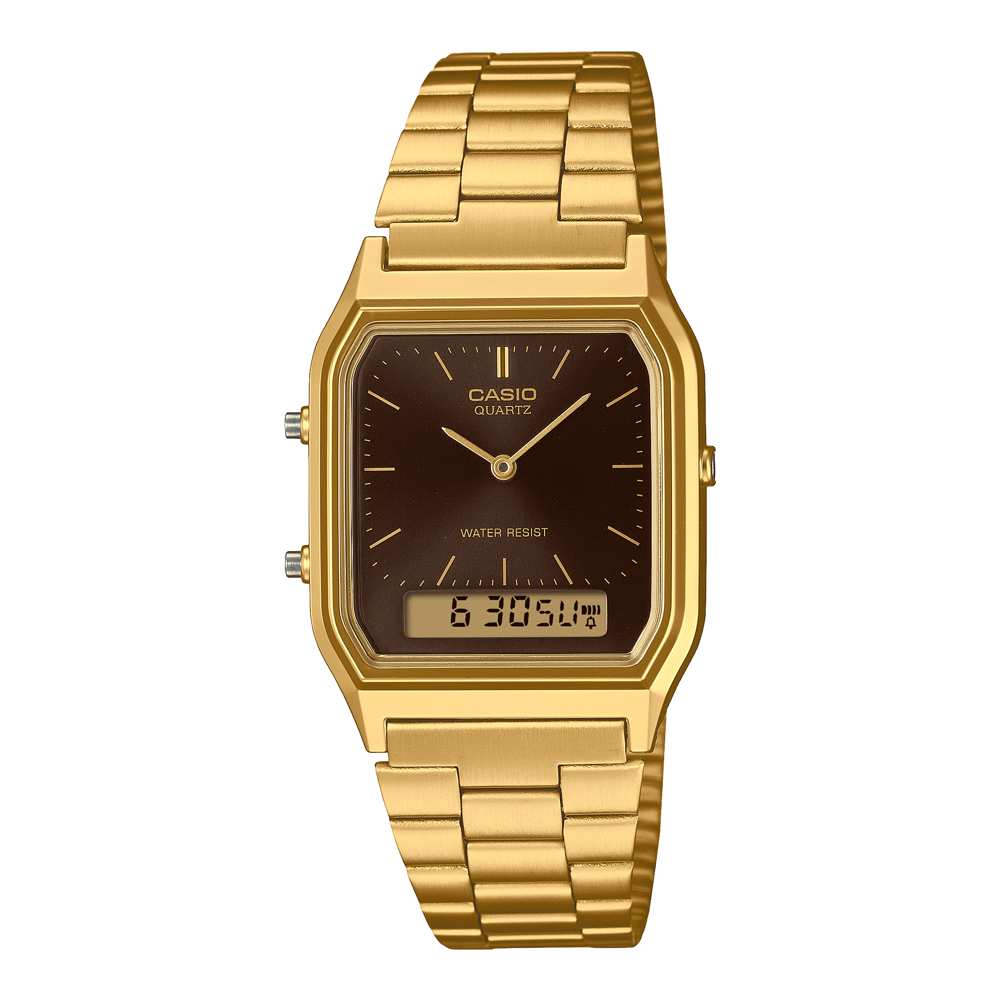 Un look vintage nei colori classici: cassa e cinturino con finitura in oro metallizzato completati da un quadrante Sunray marrone.