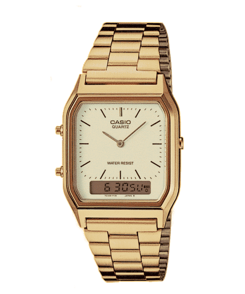 Design geometrico e doppio quadrante: l’AQ-230 è una chiara ispirazione allo stile anni’80 che strizza l’occhio alla modernità.