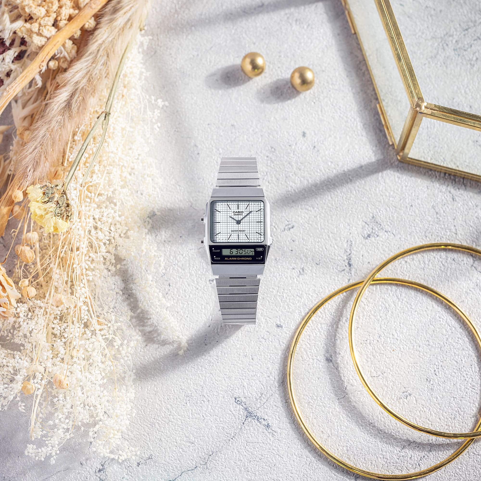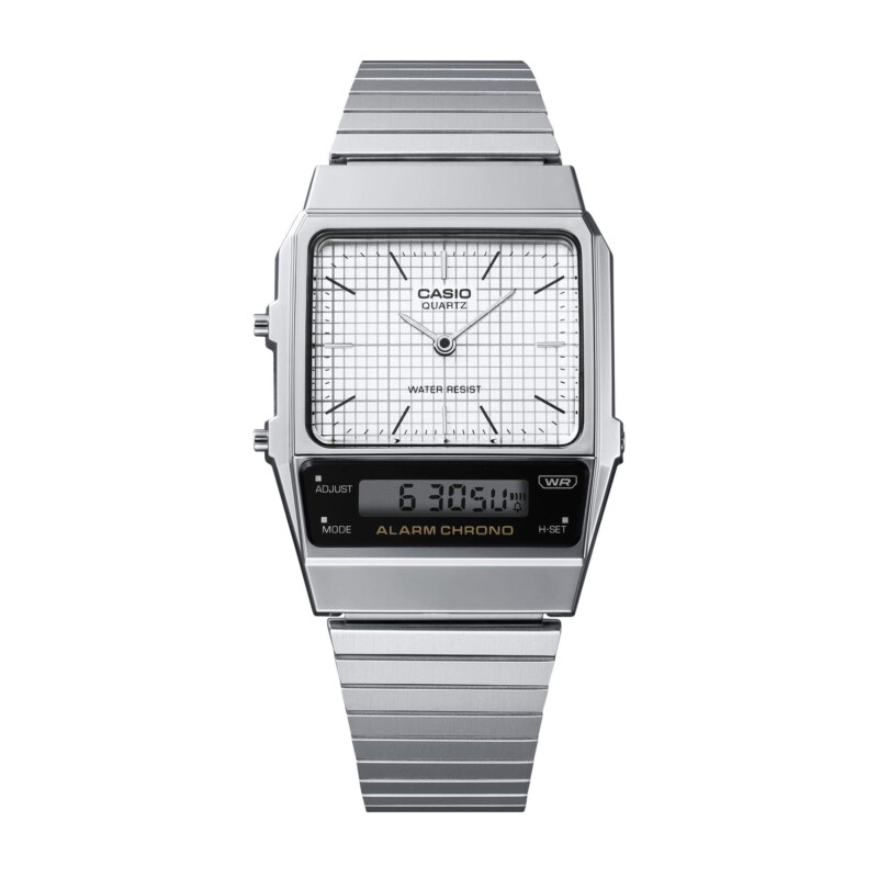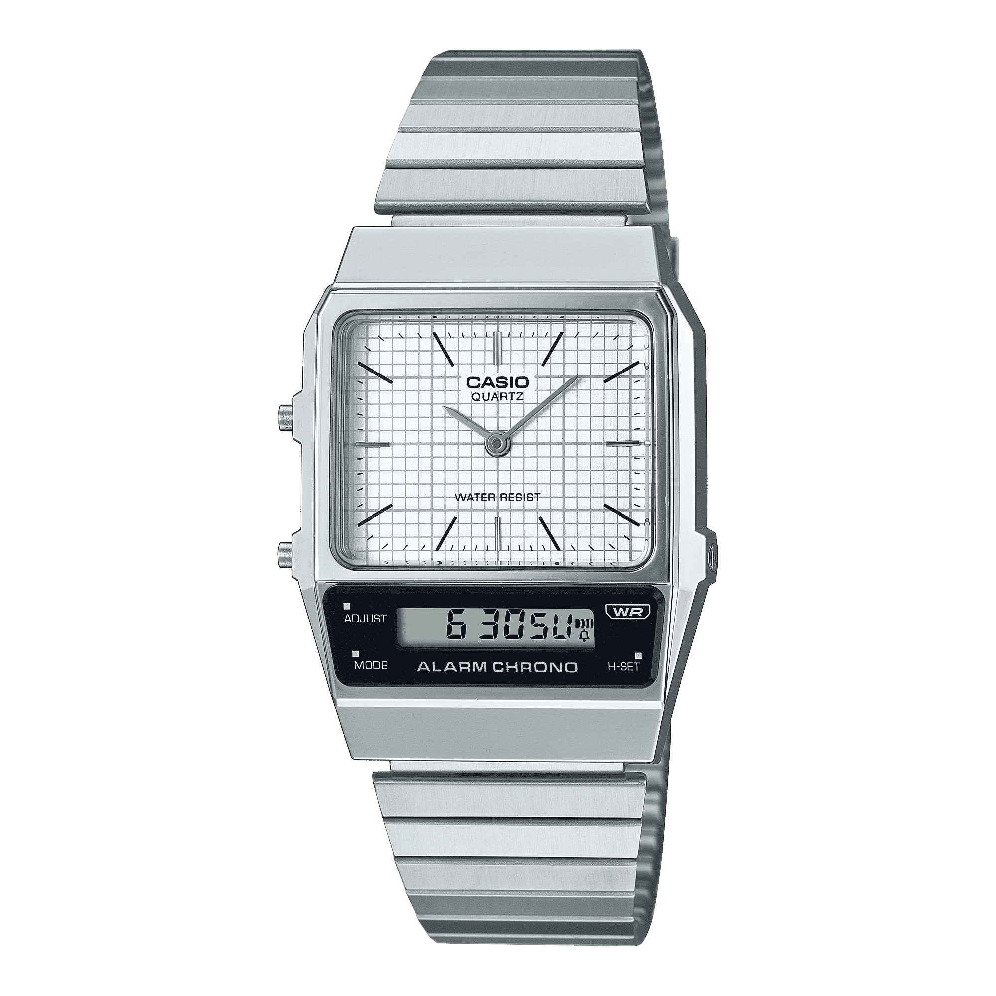 Rinnova il tuo stile retrò vintage con la modernità del design AQ-450 degli anni ’80. Questo nuovissimo orologio in stile vintage unisce un look retrò con un tocco di eleganza. Un quadrante e un display LCD separati offrono eleganza analogica e prestazioni digitali. La lieve angolazione del display LCD segue le linee delle alette, mentre il quadrante analogico presenta semplici indici a barre. Il quadrante dell’orologio decorato con un motivo a griglia aggiunge il tocco finale per un look retrò. La combinazione della cassa angolare e dei collegamenti rettilinei del cinturino metallico è una celebrazione semplice ed elegante della bellezza strutturale. Oltre a un semplice look di tendenza, questi orologi offrono funzioni pratiche come secondo fuso orario, cronometro e promemoria sonoro, nonché caratteristiche di impermeabilità per l’uso quotidiano in totale tranquillità, anche nelle giornate piovose.