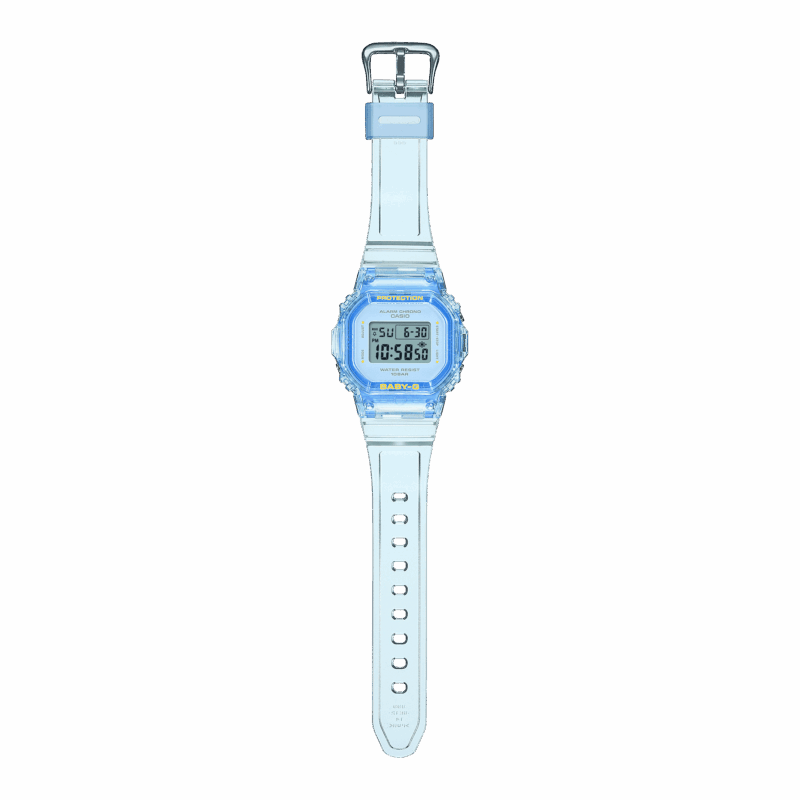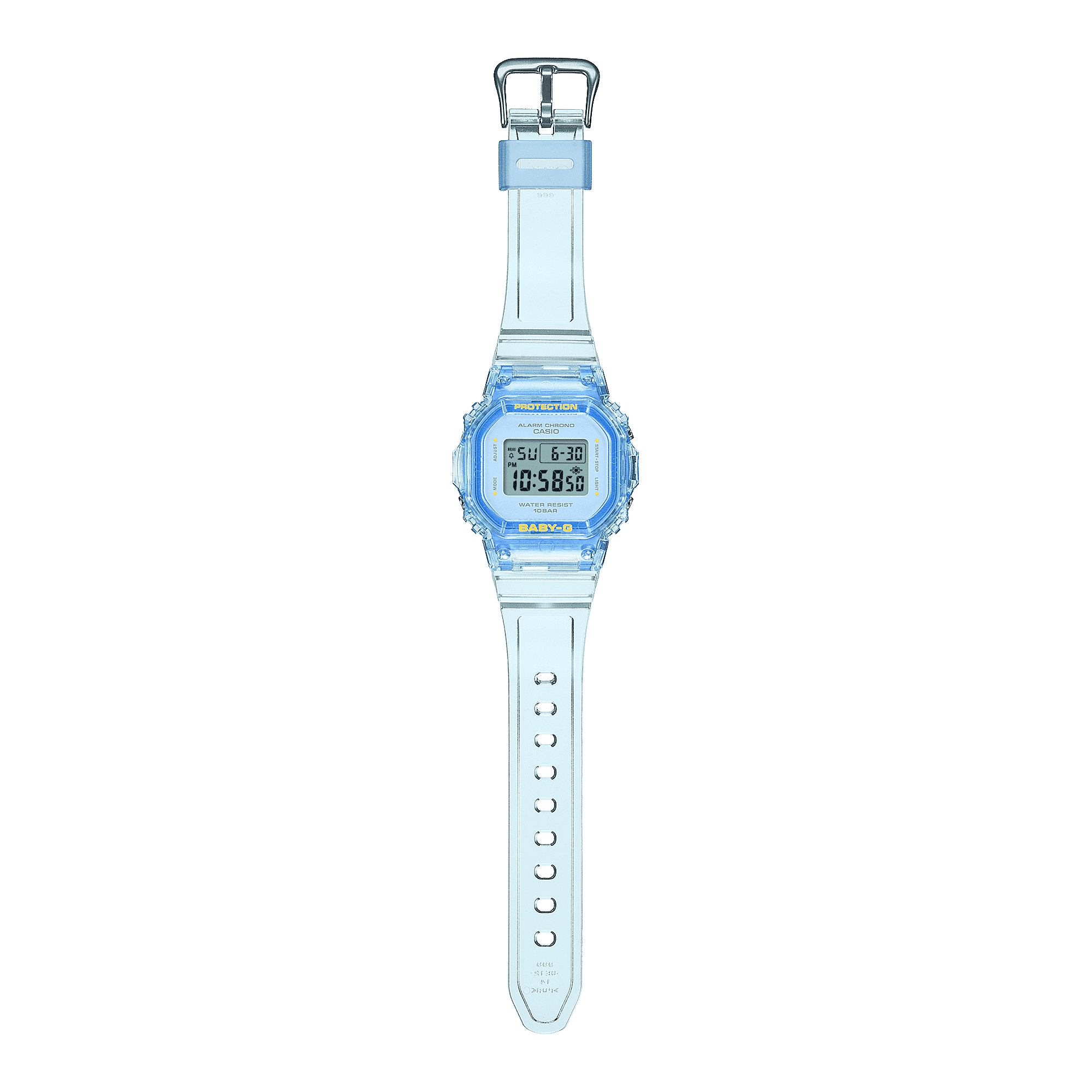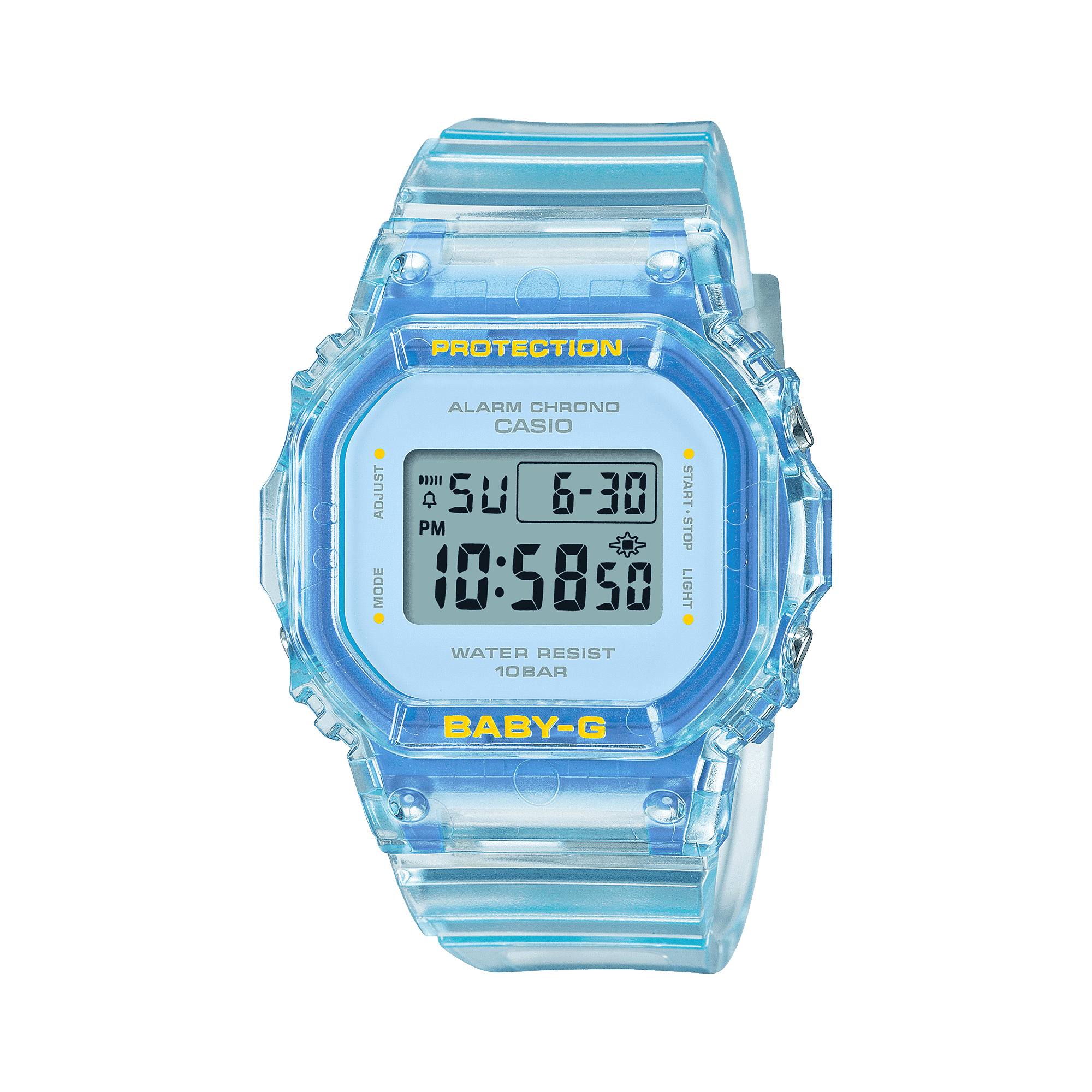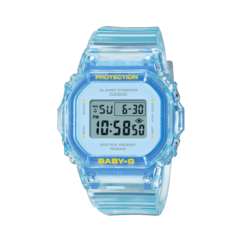 Questa rivisitazione estiva del modello BGD-565 è caratterizzata dall’iconica lunetta e dal cinturino in resina trasparente.