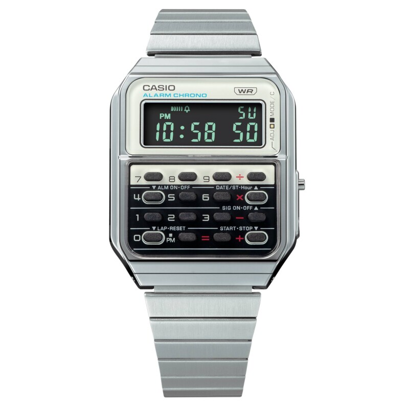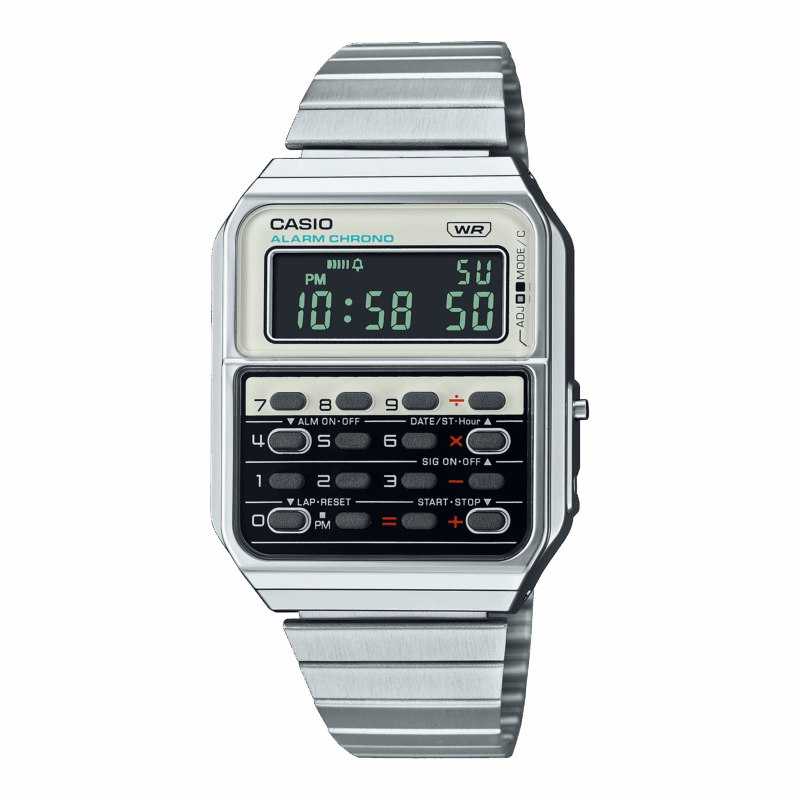 Casio ora reinterpreta questo design anni ’70 sotto forma di orologio, ereditando le combinazioni di colore della CQ-1 originale per un trio di iconici modelli CA-500 dotati della funzione calcolatrice a otto cifre.