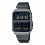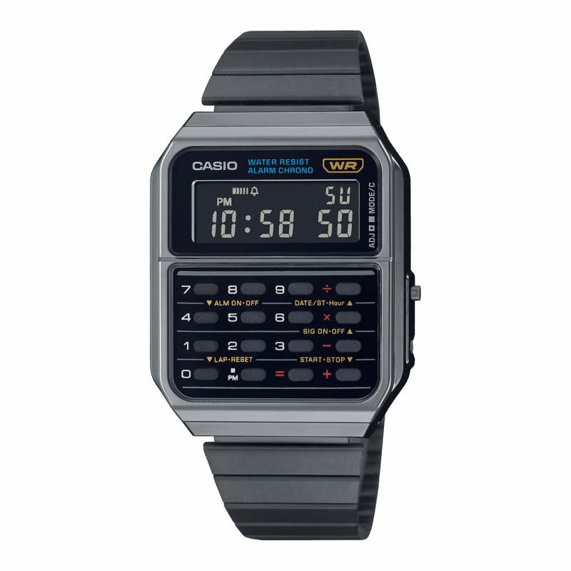 Il modello dotato di calcolatrice Casio, uno dei preferiti dagli anni ’80, rinnova il suo look con un effetto metallizzato di alta qualità. Le stesse funzioni originali della fantastica calcolatrice si abbinano a una cassa allungata e a un cinturino in metallo per un look completamente retrò.