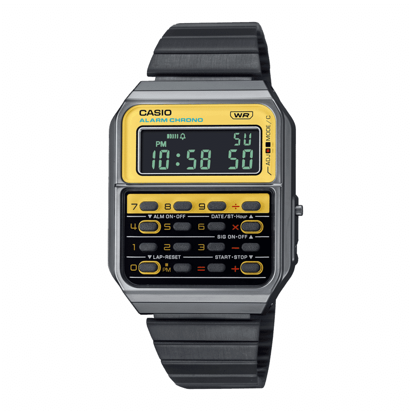 Casio ora reinterpreta questo design anni ’70 sotto forma di orologio, ereditando le combinazioni di colore della CQ-1 originale per un trio di iconici modelli CA-500 dotati della funzione calcolatrice a otto cifre.