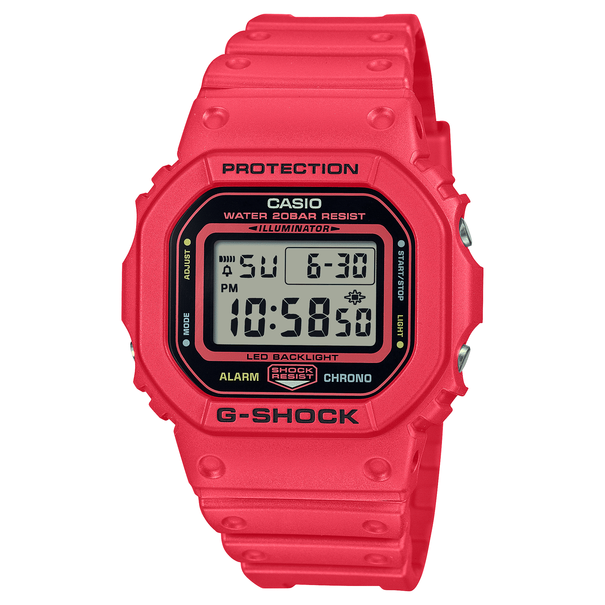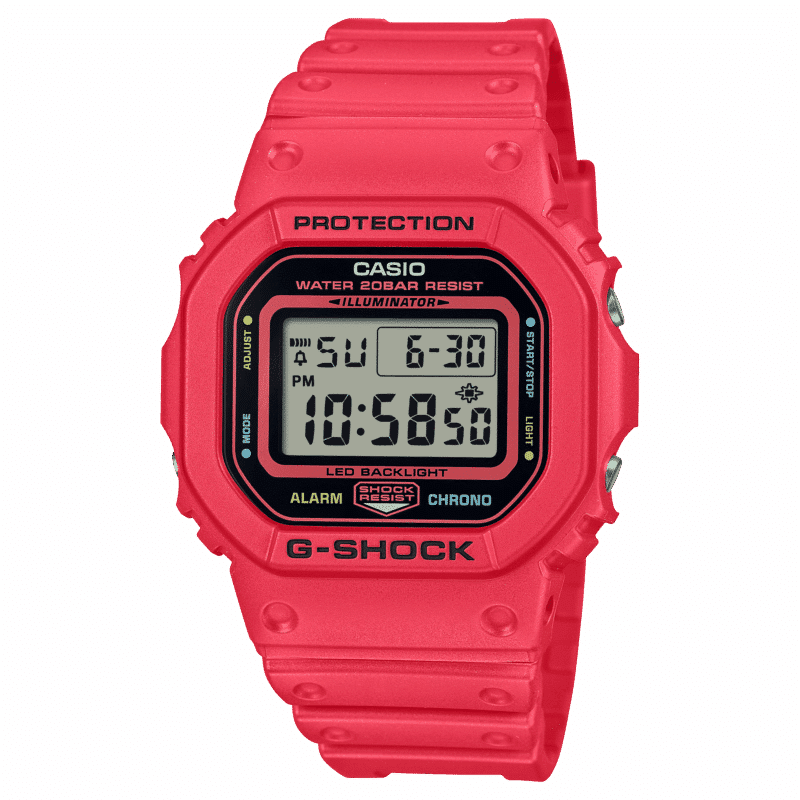 La classica cassa 5600 si presenta in un rosso vivace per dar vita ad un orologio che incarna dinamicità che gli atleti conoscono bene. Questa intensità è richiamata dal display LCD. Quando si preme il pulsante della luce LED, un fulmine attraversa il display.