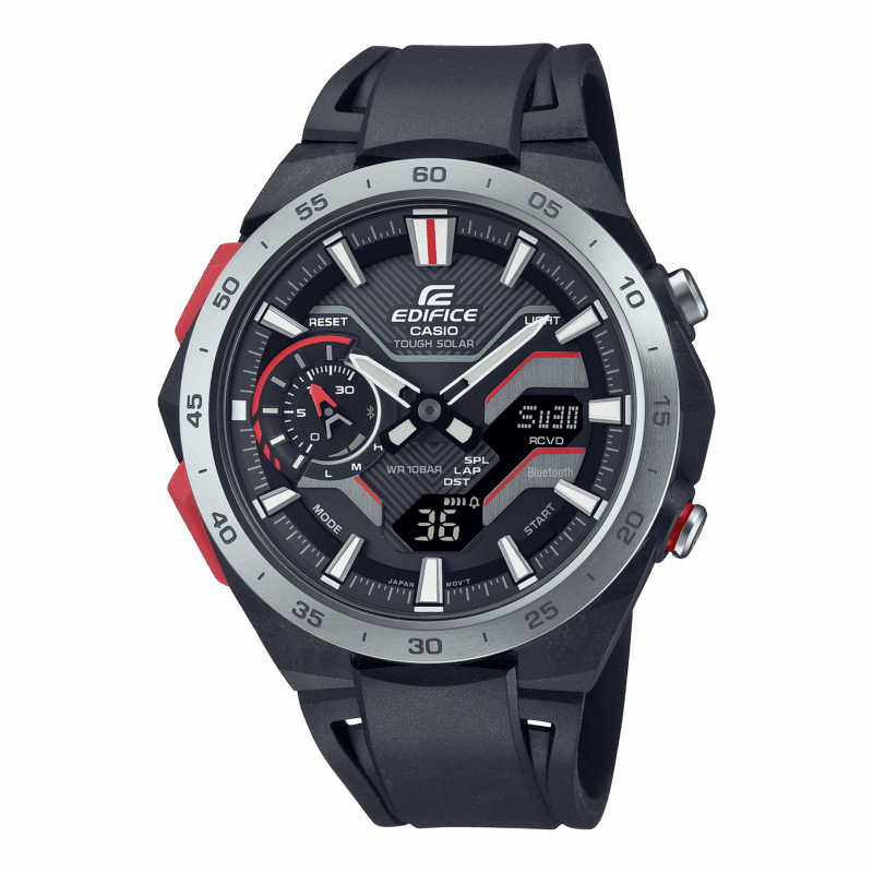 Vivi tutta l’adrenalina di una corsa su un’auto da corsa con EDIFICE WINDFLOW ECB-2200DD, il cronografo analogico digitale ispirato alle piste automobilistiche.