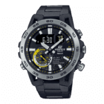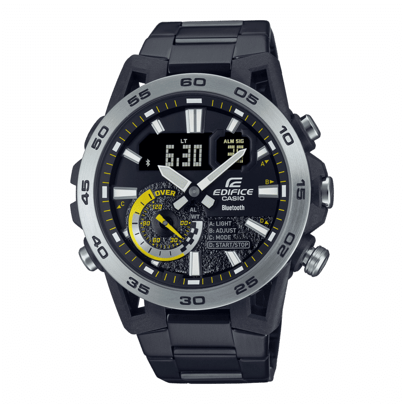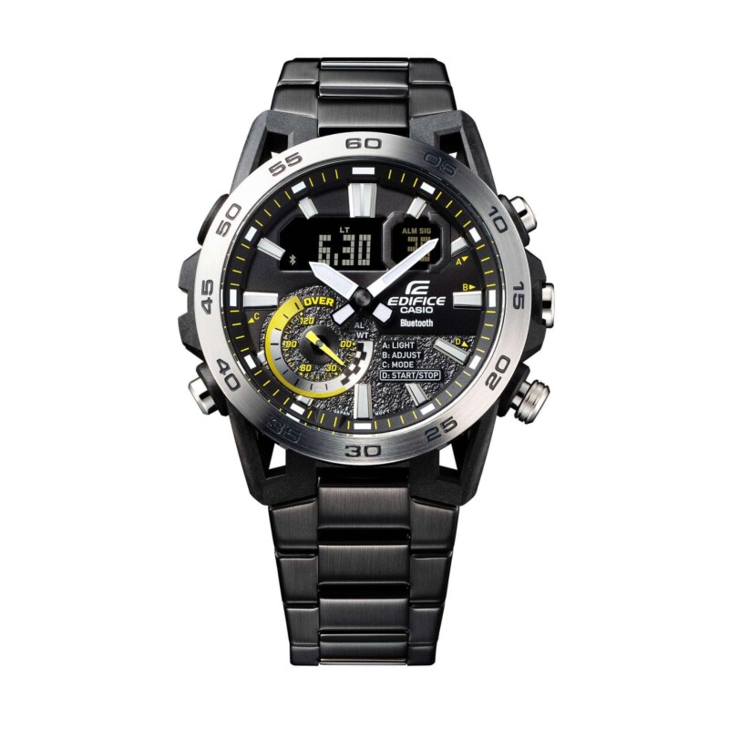 Ti presentiamo EDIFICE SOSPENSIONE ECB-40, dove le forme tipiche degli sport motoristici si fondono a funzionalità e raffinatezza, con un design che richiama il braccio delle sospensioni in resina rinforzata con fibra di carbonio e funzioni di connessione allo smartphone. L’esclusivo design della cassa si ispira alle sospensioni delle auto di Formula 1 con le alette configurate secondo una disposizione a quattro bracci, due sopra e due sotto. La resina rinforzata con fibra di carbonio rende la cassa leggera ma allo stesso tempo resistente. Grazie alla funzionalità Bluetooth, questo speciale orologio si connette automaticamente quando si trova nel raggio d’azione dello smartphone a cui è associato. Apri l’app per accedere a funzioni importantissime per i team delle scuderie automobilistiche: indicazione accurata dell’ora con regolazione automatica fino all’ultimo secondo, gestione semplice dell’ora internazionale e trasferimento allo smartphone dei dati misurati dal cronometro fino al millisecondo per un massimo di 200 giri. Il Super Illuminator (doppia luce LED ad alta luminosità) illumina il display analogico-digitale garantendo una leggibilità anche al buio.