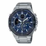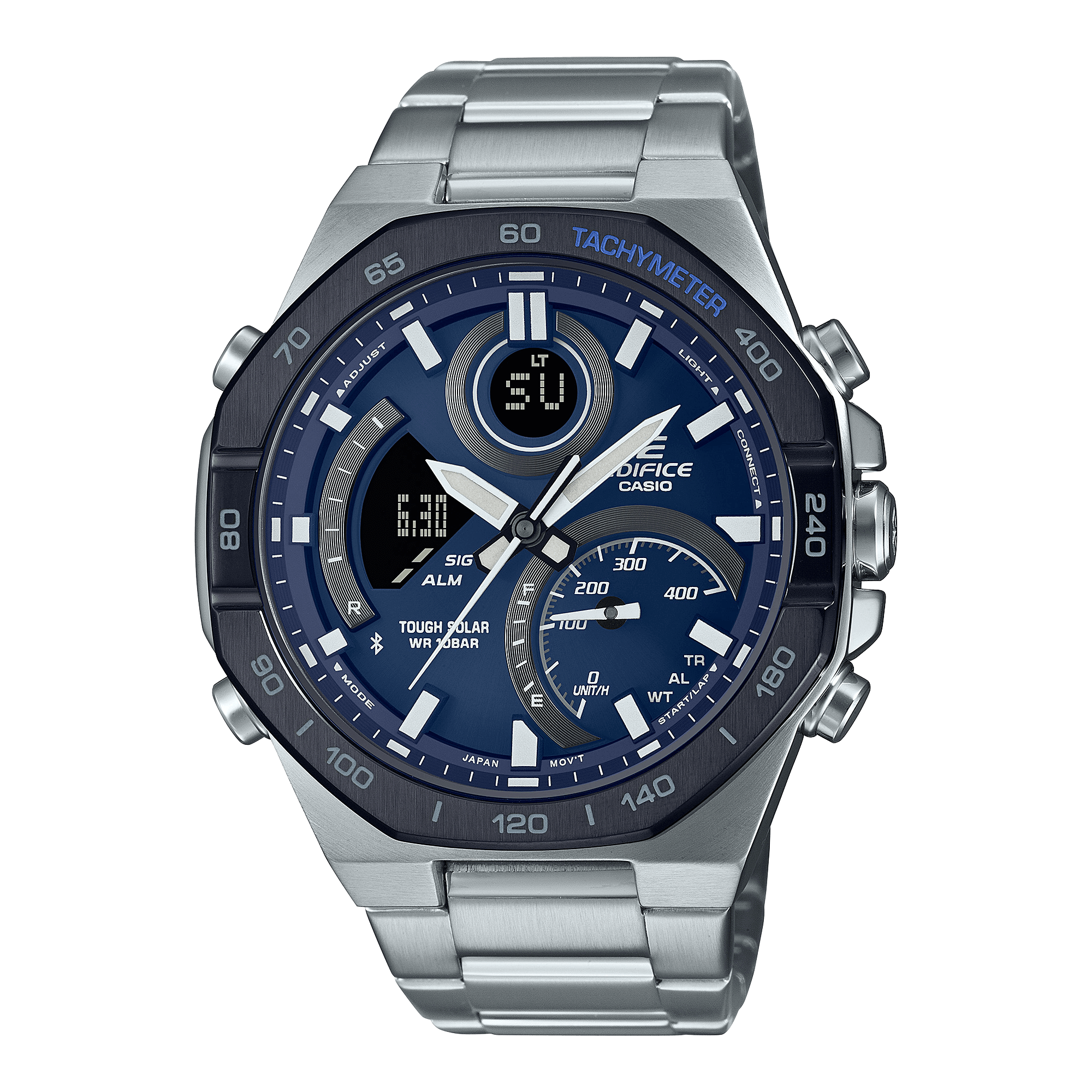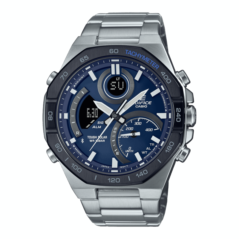 Connettività con lo smartphone e molto altro in un orologio combinato analogico-digitale EDIFICE, realizzato per proiettare velocità e intelligenza. Il design audace e sofisticato è caratterizzato da una lunetta ottagonale che evoca le linee degli utensili di un meccanico di auto da corsa. Questo orologio non si limita ad attirare gli sguardi, ma offre funzionalità complete che consentono di ottenere tutte le informazioni necessarie grazie alle lancette e al display LCD di facile lettura. Sincronizzazione con lo smartphone tramite Bluetooth® per una precisa indicazione dell’ora, ovunque tu vada. Basta toccare l’app per gestire facilmente funzioni come la selezione di una città dall’elenco Ora internazionale. Sul grande quadrante a incasso, nella posizione dell’indicazione delle 4, è presente un indicatore di velocità che visualizza le velocità medie quando si cronometrano i tempi dei giri per le distanze impostate. La luce a LED completamente automatica illumina il quadrante e il display LCD non appena si inclina il polso. Tough Solar ricarica l’orologio con la luce del sole o anche di una lampada fluorescente.