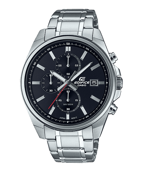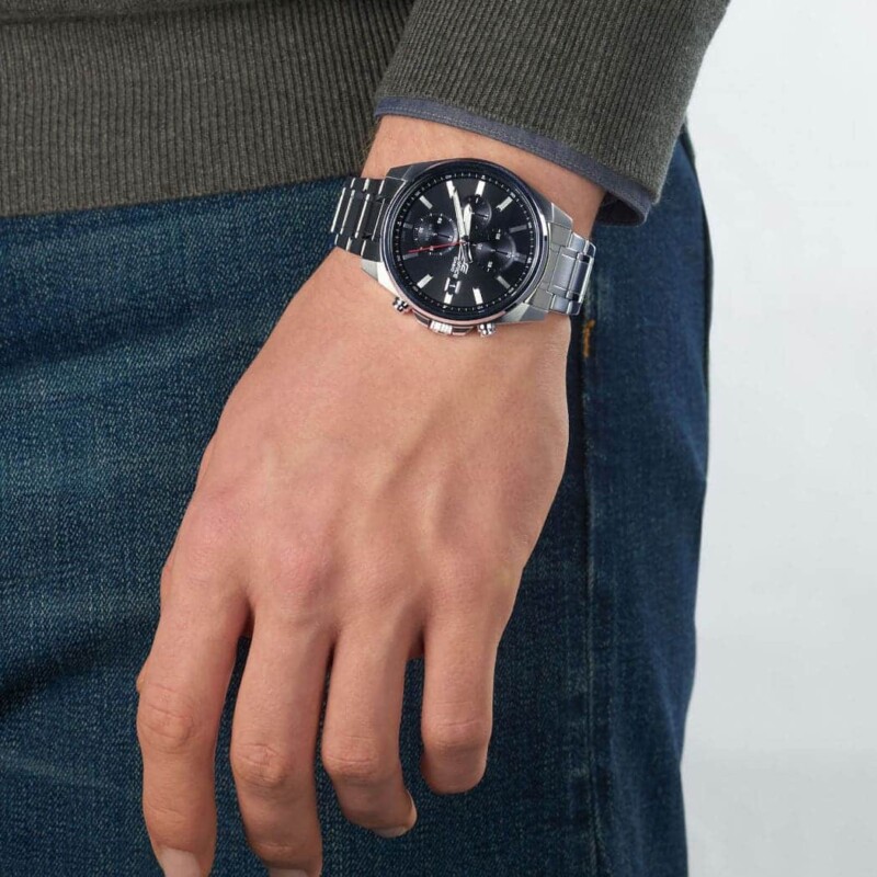 Cronografo EDIFICE standard di medie dimensioni. Progettato per avere un aspetto moderno e sportivo, il modello presenta una lunetta sottile e un ampio quadrante dal design semplice. La lancetta dei secondi è di colore rosso sportivo.