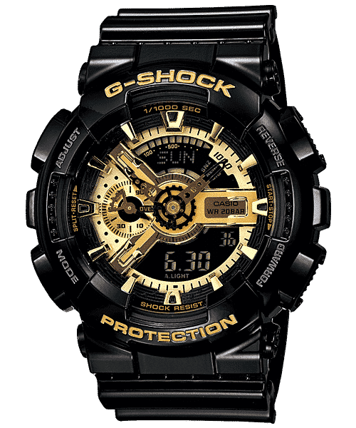 Un modello della serie G-SHOCK nero e oro, che continua la ricerca della resistenza. Utilizza il GA-110 come modello base, con funzioni e design originali. Dotato di tachimetro e di quadrante dal design tridimensionale con piccole parti a strati. La colorazione è in oro lucido energico su una caratteristica struttura nera G-SHOCK. La vernice lucida su tutta la struttura e la texture del trattamento a specchio applicato su tutto il modulo si combinano per creare un design splendido e alla moda. Un G-SHOCK che combina tecnologia e design avanzato.