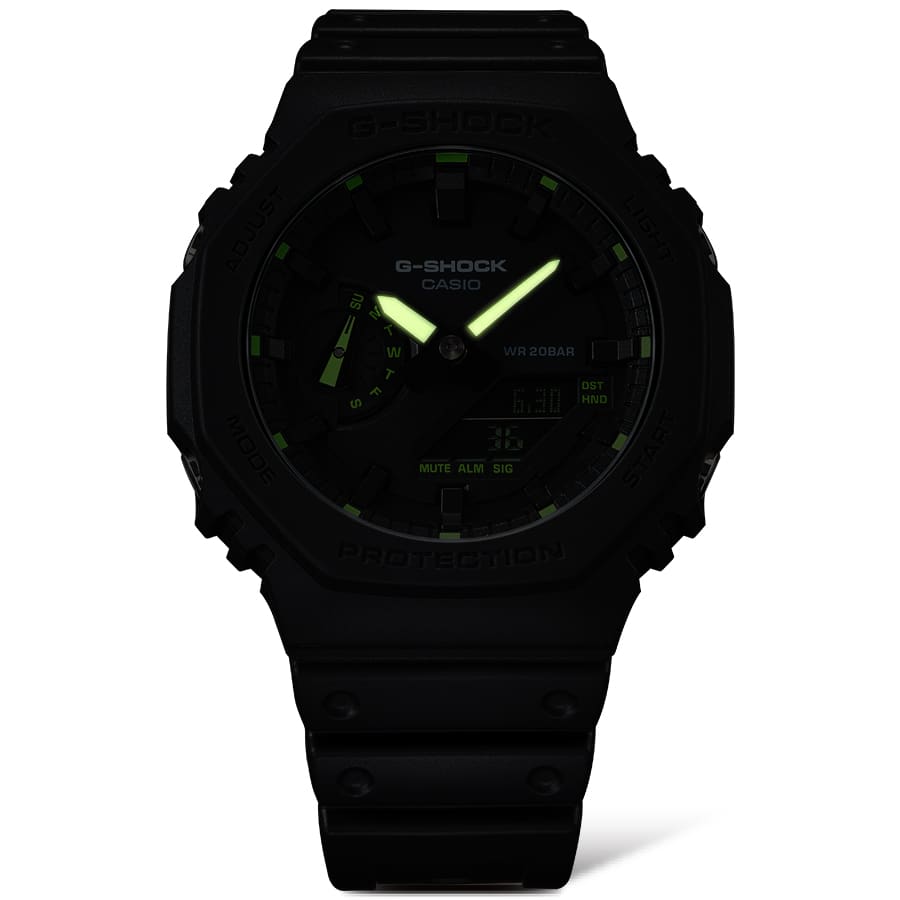 G-SHOCK, il brand di orologi indistruttibili, si evolve in un’infinita ricerca di estrema forza e resistenza. Il modello 2100 è una combinazione di digitale-analogico che eredita il concetto dei modelli DW-5000C di prima generazione, aggiornandolo ai giorni nostri con un design ottagonale. Inoltre, l’orologio raggiunge uno spessore di 11,8 mm grazie a una resina fine estremamente rigida, irrobustita dalla fibra di carbonio. L’orologio inoltre presenta dettagli fluo, per esaltare il tuo look!