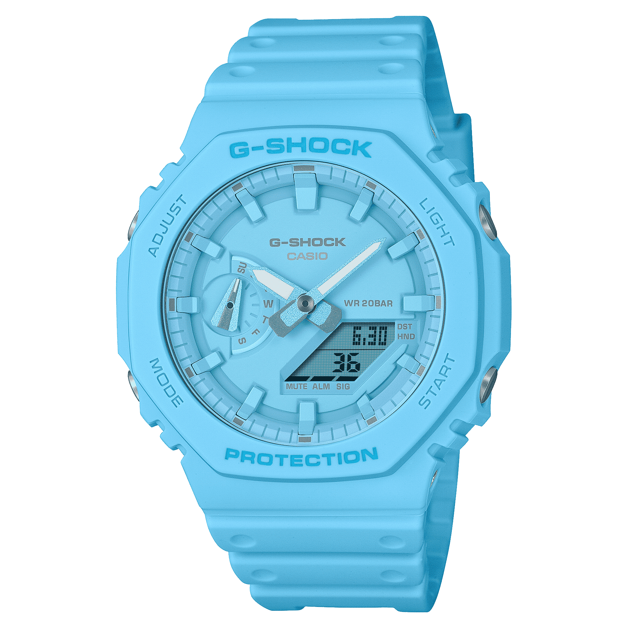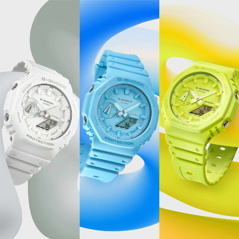 Dai il benvenuto alla serie G-SHOCK Tone-on-tone dallo stile monocromo con colori vivaci e brillanti. Il modello GA-2100 con la cassa ottagonale è reinterpretato in un design monocromatico disponibile in tre colori di tendenza: azzurro, bianco e lime.