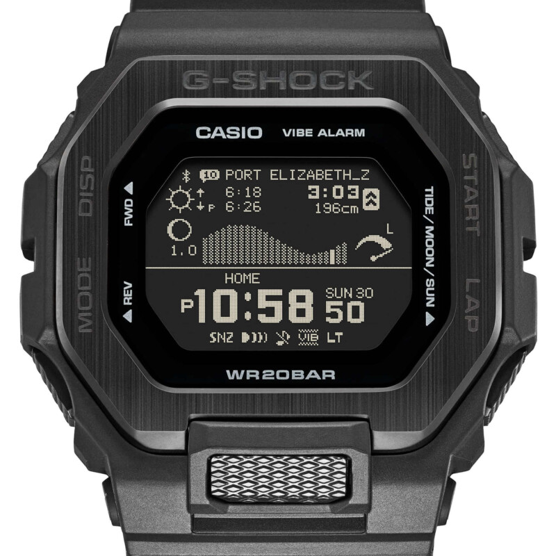 Realizzato per affrontare anche le cadute più folli tra le onde, la struttura dell’orologio offre una protezione a 360° contro gli urti. Le finiture della lunetta in acciaio inox aggiungono il tocco finale al GBX-100!