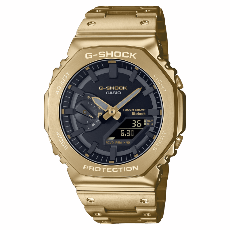 Siamo lieti di presentarti il modello DW-5000C completamente in metallo: il nuovo arrivato nella linea di orologi 2100 in continua evoluzione, che coglie l’eredità del primo G-SHOCK mai realizzato. La sua elegante struttura interamente in metallo, con retro dotato di blocco a vite, lunetta e cinturino in acciaio inossidabile, crea un design essenziale e minimalista, proteggendo, al contempo, il modulo dagli urti in caso di caduta. Il montaggio ad alta densità mantiene sottile il modulo combinato analogico-digitale, fornendo contemporaneamente le avanzate funzioni apprezzate in un profilo compatto per una vestibilità confortevole. Torniamo indietro nel tempo con la lunetta ottagonale e il design zigrinato del cinturino, tutti realizzati in metallo, che risalgono al modello originale del 1983. La lunetta e il cinturino sono rivestiti con una placcatura ionica in oro giallo. La lunetta in acciaio inossidabile, formata tridimensionalmente mediante un lungo processo di forgiatura, taglio e lucidatura, è rifinita con un trattamento circolare a linea sottile sulla superficie superiore e una lucidatura a specchio sui lati. Si può associare allo smartphone tramite Bluetooth®. È sufficiente toccare l’app dedicata per mantenere la regolazione precisa dell’orario e tenere il passo con i tempi. Con Tough Solar, una luce LED ad alta luminosità e una gamma di altre funzioni pratiche, questo orologio offre stile e praticità.