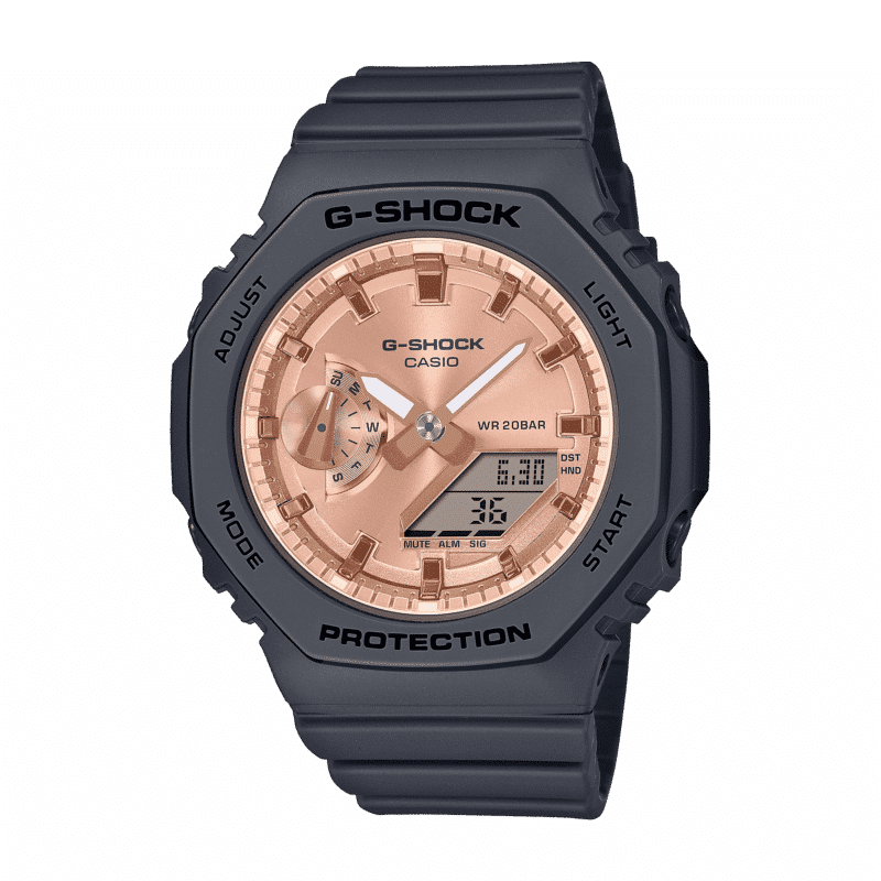 Aggiungi un tocco di originalità sul polso indossando il G-SHOCK con dettagli in oro rosa. Questi orologi GMA-S2100 sono caratterizzati da un quadrante rifinito con dettagli in oro rosa per un look essenziale, minimalista e scintillante.
