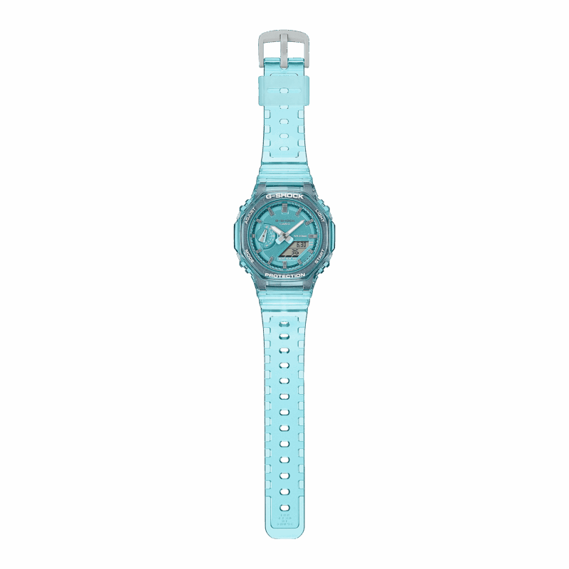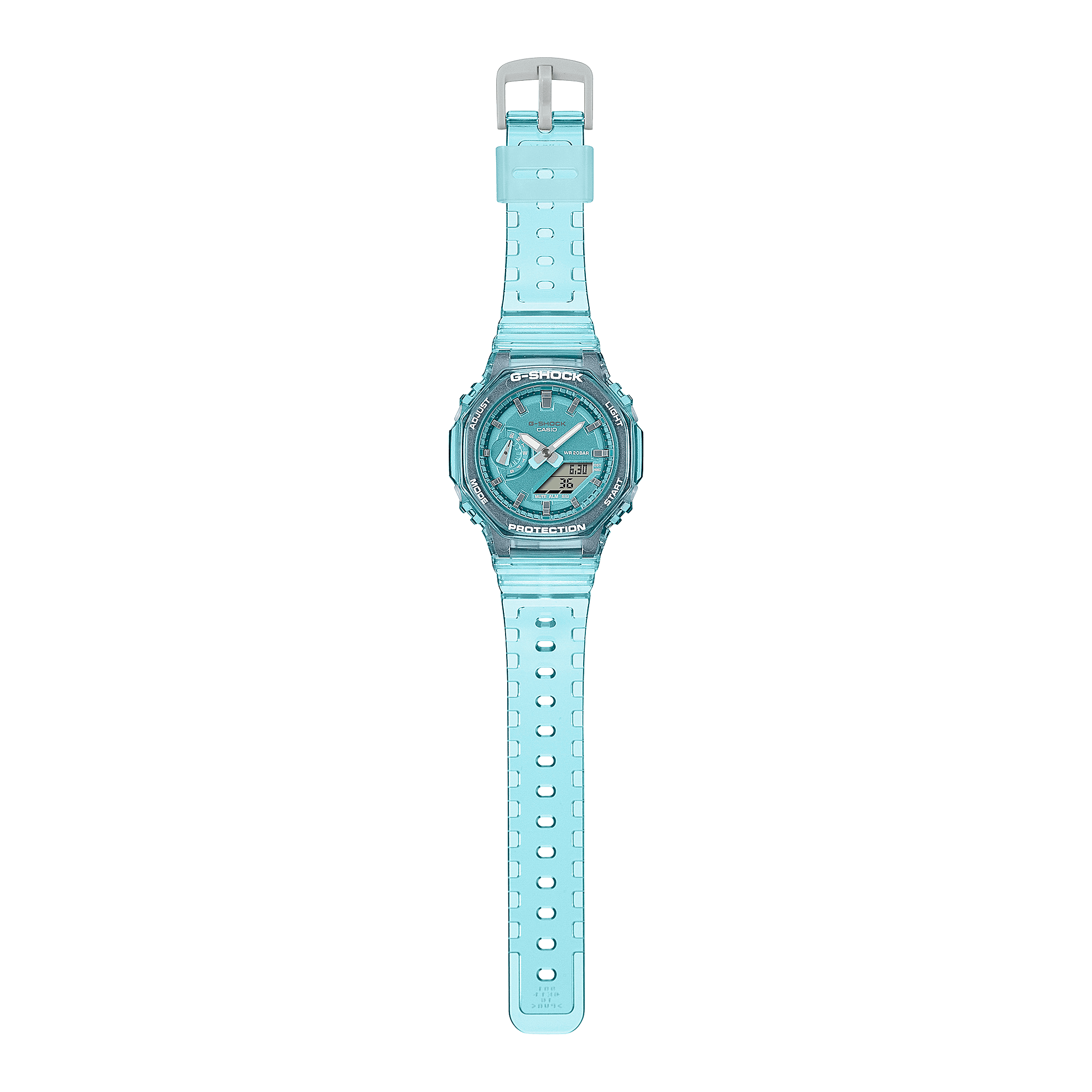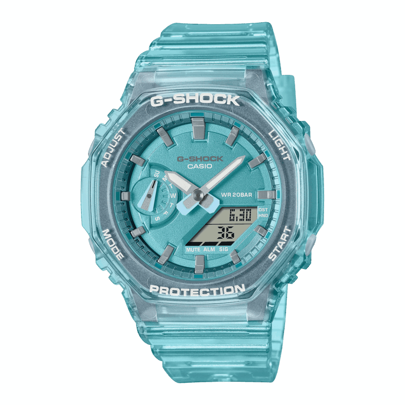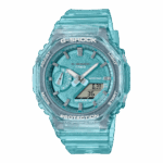 Tuffati in un’esperienza di puro piacere metallico con l’iconica combinazione di analogico-digitale del GA-2100 in un profilo più sottile e compatto. Design traslucido metallico in una scelta di colori per orologi versatili che si abbinano a qualsiasi outfit, tutto l’anno. Gli indici sull’orologio, trattati con una finitura a deposizione da vapore semi-opaca, gli conferiscono un look trasparente e metallico. Il quadrante e il suo anello nei modelli blu e rosa sono trattati con vernice micro-polarizzata per creare un bagliore misterioso e sottile.