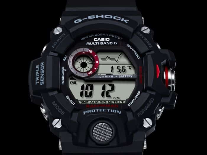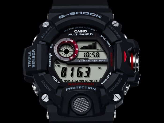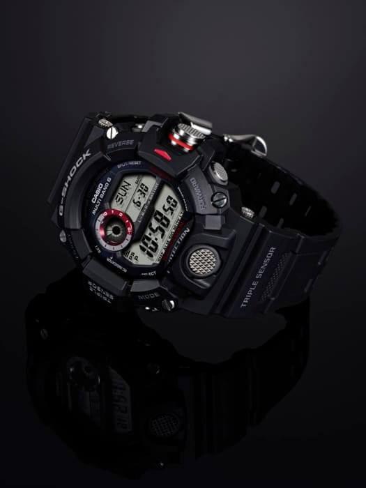 Ecco RANGEMAN, l’ultima aggiunta alla serie Master of G di orologi solidi e resistenti, disegnati e progettati per resistere alle condizioni più estreme immaginabili. RANGEMAN è dotato di sensore triplo che lo rende in grado di mantenere a portata di mano le letture di altitudine, pressione barometrica, temperatura e direzione. I pulsanti cilindrici offrono un funzionamento eccezionale e una migliore resistenza agli urti. Il pulsante del sensore utilizzato di frequente (al centro a destra) è dotato di un rivestimento in metallo che lo protegge dall’impatto laterale e impedisce l’ingresso di corpi estranei. Premendo il pulsante del sensore in qualsiasi modalità si passa direttamente a uno schermo del sensore. Ogni modalità sensore ha un proprio segnale acustico, il che significa che è possibile determinare la modalità di ingresso senza nemmeno guardare l’orologio. Tutto questo, oltre alla registrazione dell’ora con un solo tasto, alla misurazione del tempo trascorso con un solo tasto, alla solidità e alla durata del G-SHOCK, e molto altro ancora, rende RANGEMAN la scelta perfetta per rangers, personale di soccorso e chiunque altro la cui professione o le cui attività richiedono un’affidabilità senza pari.