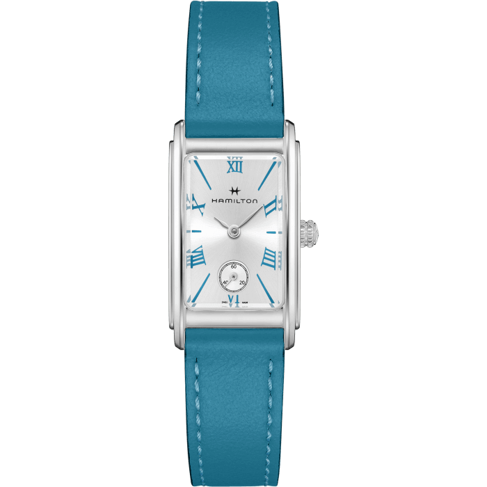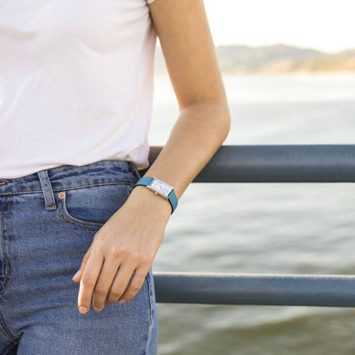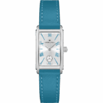 Grazie al cinturino in pelle nelle vivaci tonalità turchese e ai numeri romani in colori abbinati, il Lady Ardmore Quartz non è più solo una reinterpretazione Art Deco, ma diventa una dichiarazione all’avanguardia. Sofisticata e giocosa, la cassa spigolosa fonde in modo impeccabile il classico stile americano con le tonalità contemporanee, per un look che non passa inosservato.