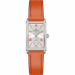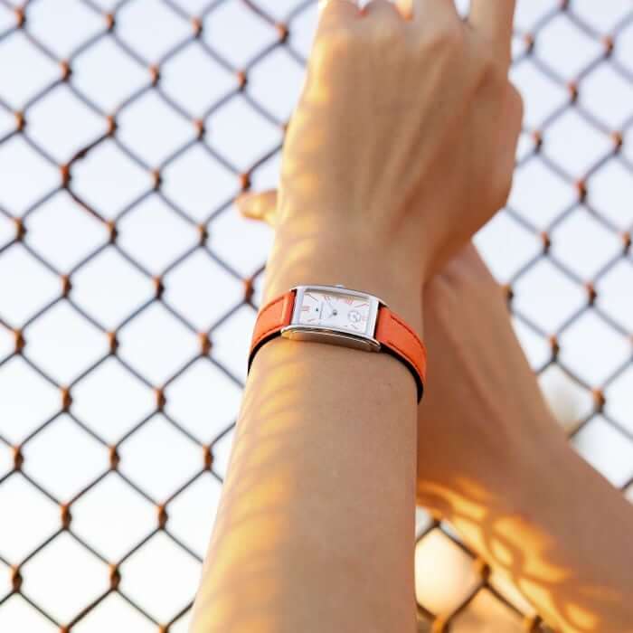 Grazie al cinturino in pelle nelle vivaci tonalità corallo e ai numeri romani in colori abbinati, il Lady Ardmore Quartz non è più solo una reinterpretazione Art Deco, ma diventa una dichiarazione all’avanguardia. Sofisticata e giocosa, la cassa spigolosa fonde in modo impeccabile il classico stile americano con le tonalità contemporanee, per un look che non passa inosservato.