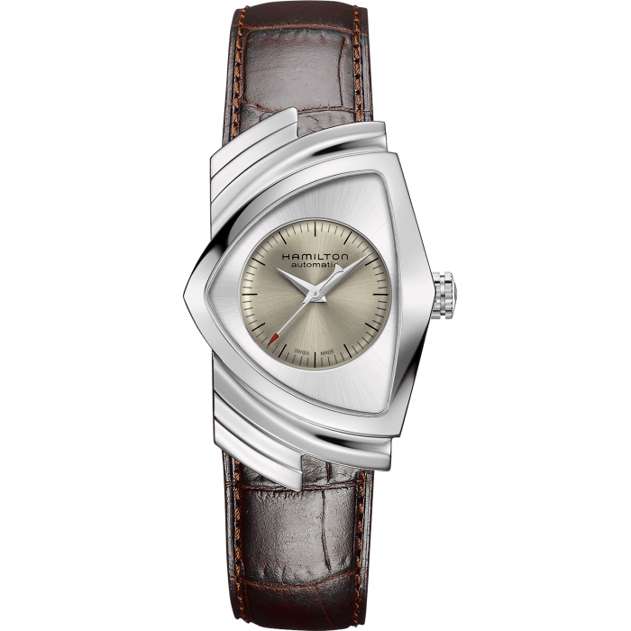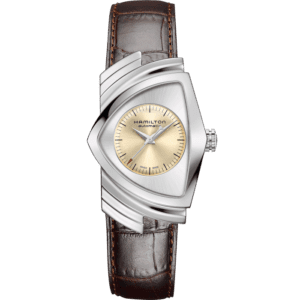 La cassa asimmetrica dell’iconico Ventura porta la firma inconfondibile del design Hamilton del 1957. Molto imitato ma mai eguagliato, il Ventura resta un simbolo intramontabile nella gloriosa storia della Maison. Il quadrante dalla linea sobria cela un movimento automatico di qualità prodotto in Svizzera.