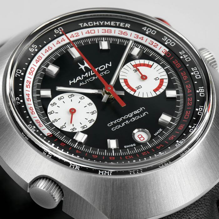 Inconfondibile e audace, questo orologio non passa certamente inosservato. Il Count-Down si basa sul Chrono-Matic E ed è limitato a 1.972 esemplari. Animato dal movimento automatico H-31, con i suoi 48 mm si fa decisamente notare. Il quadrante “reverse panda” rappresenta la firma stilistica di Hamilton. Gli audaci dettagli rossi sottolineano il dinamismo di questo segnatempo multifunzione che include il timer (“countdown”) da cui l’orologio prende il nome.