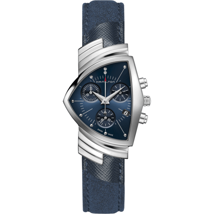Nel 1957, Hamilton presenta il primo orologio elettrico: il Ventura. Questo segnatempo rivoluzionario apre una nuova era dell’orologeria, imponendosi come un emblema del design futuristico e come un simbolo dell’innovazione. Ispirato al singolo di successo di Elvis Presley, “Blue Suede Shoes”, il Ventura Chronograph Quartz è animato da un movimento al quarzo di precisione da 23 rubini, con un quadrante con sfumatura blu che include tre contatori che misurano secondi, minuti e ore. Il Ventura Chronograph Quartz è disponibile in una cassa in acciaio inossidabile abbinata a un cinturino in Alcantara blu.