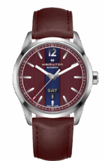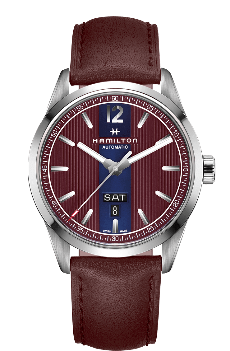 Bordeaux e blu, sono questi i colori che contraddistinguono questo orologio. Hamilton, Day Date Auto. orologio con movimento automatico di origine svizzera che è possibile ammirare sul retro della cassa. Hamilton modello Day Date Auto.