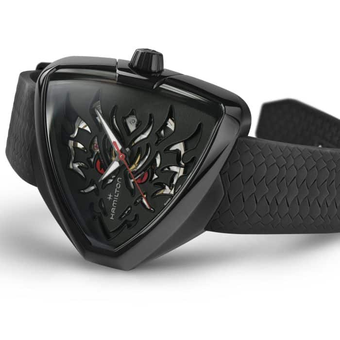 La figura del drago racchiude tanti meravigliosi significati nella cultura orientale: oltre alla forza e alla fortuna, rappresenta anche uno spirito intraprendente ed è spesso il simbolo di opportunità e successo. Caratterizzato da un volto di drago nero con occhi rossi fiammeggianti, e da una decisa sfera dei secondi rossa, il Ventura Elvis80 Skeleton Dragon è abbinato a un cinturino in caucciù che richiama le squame di drago in 3D. Sotto il quadrante batte il movimento H-10-S con riserva di carica di 80 ore e spirale in Nivachron™, oltre alle sfere delle ore e dei minuti rivestite in Super-LumiNova® per garantire la leggibilità notturna.