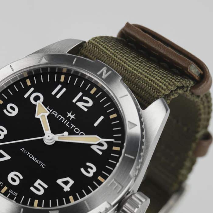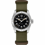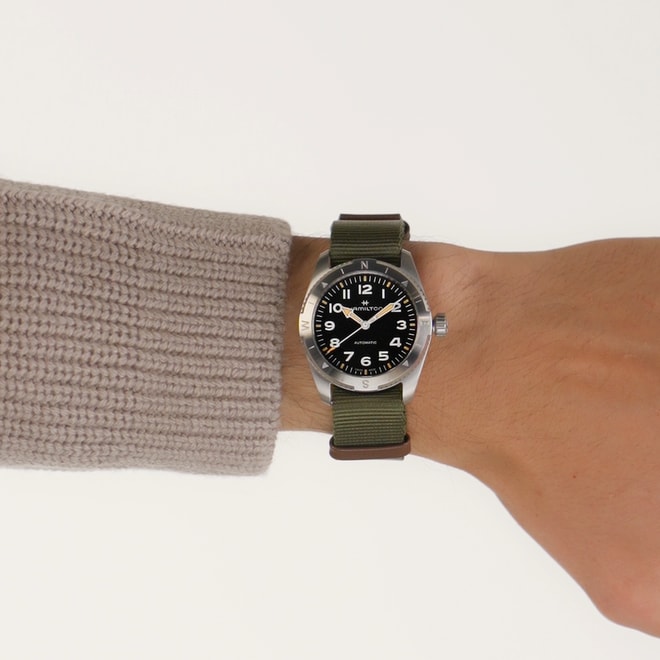 Prepararsi per le avventure all’aria aperta non è mai stato così facile grazie al Khaki Field Expedition e al suo nuovo cinturino NATO. Un orologio ideale per tutte le attività outdoor con un design a bussola, che ti permetterà, durante le escursioni, di orientarti con l’aiuto del sole. Racchiuso in una cassa in acciaio da 37 mm corredata da un cinturino NATO in tessuto verde, il segnatempo è dotato di corona a vite e di un quadrante nero con finitura sabbiata, che lo rendono estremamente resistente.