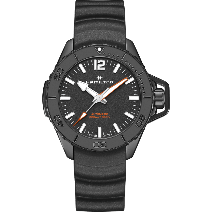 Con un nuovo look audace, il Khaki Navy Frogman Automatic è l’orologio Hamilton tecnicamente migliore per le avventure in mare. Progettato per garantire precisione, leggibilità e resistenza, porta l’insondabile potenza dell’oceano al polso. È inoltre dotato di una protezione della corona dalla forma unica, e di un cinturino in caucciù ondulato.
