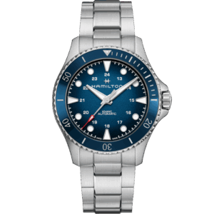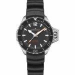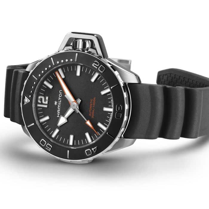 Il Khaki Navy Frogman Automatic si distingue per le prestazioni tecniche e l’iconico design. La sua cassa in acciaio da 41 mm è dotata di una corona a vite protetta da un robusto copricorona a forma di ponte per garantire l’impermeabilità fino a 30 bar (300 m), un omaggio al design del Frogman originale. Il Khaki Navy Frogman Automatic da 41 mm vanta un quadrante nero con strati di Super-LumiNova® per garantire una lettura precisa in qualsiasi circostanza e un cinturino in caucciù ondulato nero che ricorda il mare in movimento. Funzionale ed estremamente pratico, questo segnatempo è l’alleato perfetto per le tue avventure in mare e sulla terraferma.