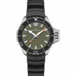 Il Khaki Navy Frogman Automatic si distingue per le prestazioni tecniche e l’iconico design. La sua cassa in acciaio da 41 mm è dotata di una corona a vite protetta da un robusto copricorona a forma di ponte per garantire l’impermeabilità fino a 30 bar (300 m), un omaggio al design del Frogman originale. Il Khaki Navy Frogman Automatic da 41 mm vanta un quadrante verde scuro con Super-LumiNova® applicato su indici e sfere per garantire una lettura precisa in qualsiasi circostanza e un cinturino in caucciù ondulato nero che ricorda il mare in movimento. Funzionale ed estremamente pratico, questo segnatempo è l’alleato perfetto per le tue avventure in mare e sulla terraferma.
