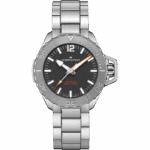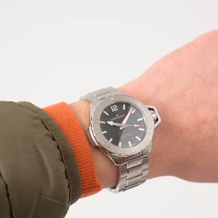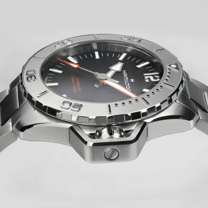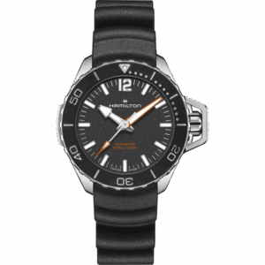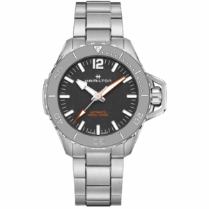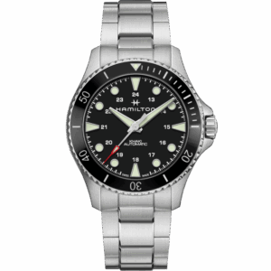 Il Khaki Navy Frogman Automatic si distingue per le prestazioni tecniche e l’iconico design. La sua cassa in acciaio da 41 mm è dotata di una corona a vite protetta da un robusto copricorona a forma di ponte per garantire l’impermeabilità fino a 30 bar (300 m), un omaggio al design del Frogman originale. Il Khaki Navy Frogman Automatic da 41 mm vanta un quadrante nero con Super-LumiNova® applicato su indici e sfere per garantire una lettura precisa in qualsiasi circostanza e un imponente bracciale in acciaio. Funzionale ed estremamente pratico, questo segnatempo è l’alleato perfetto per le tue avventure in mare e sulla terraferma.