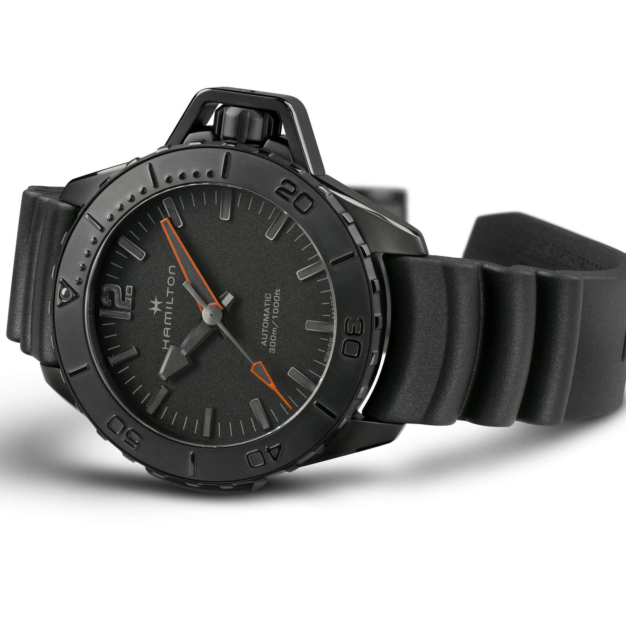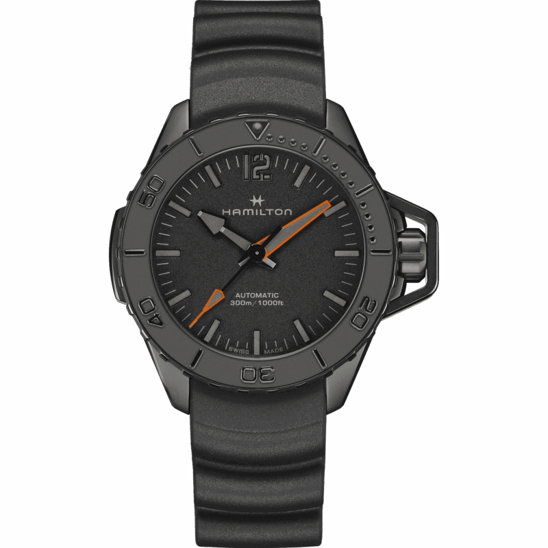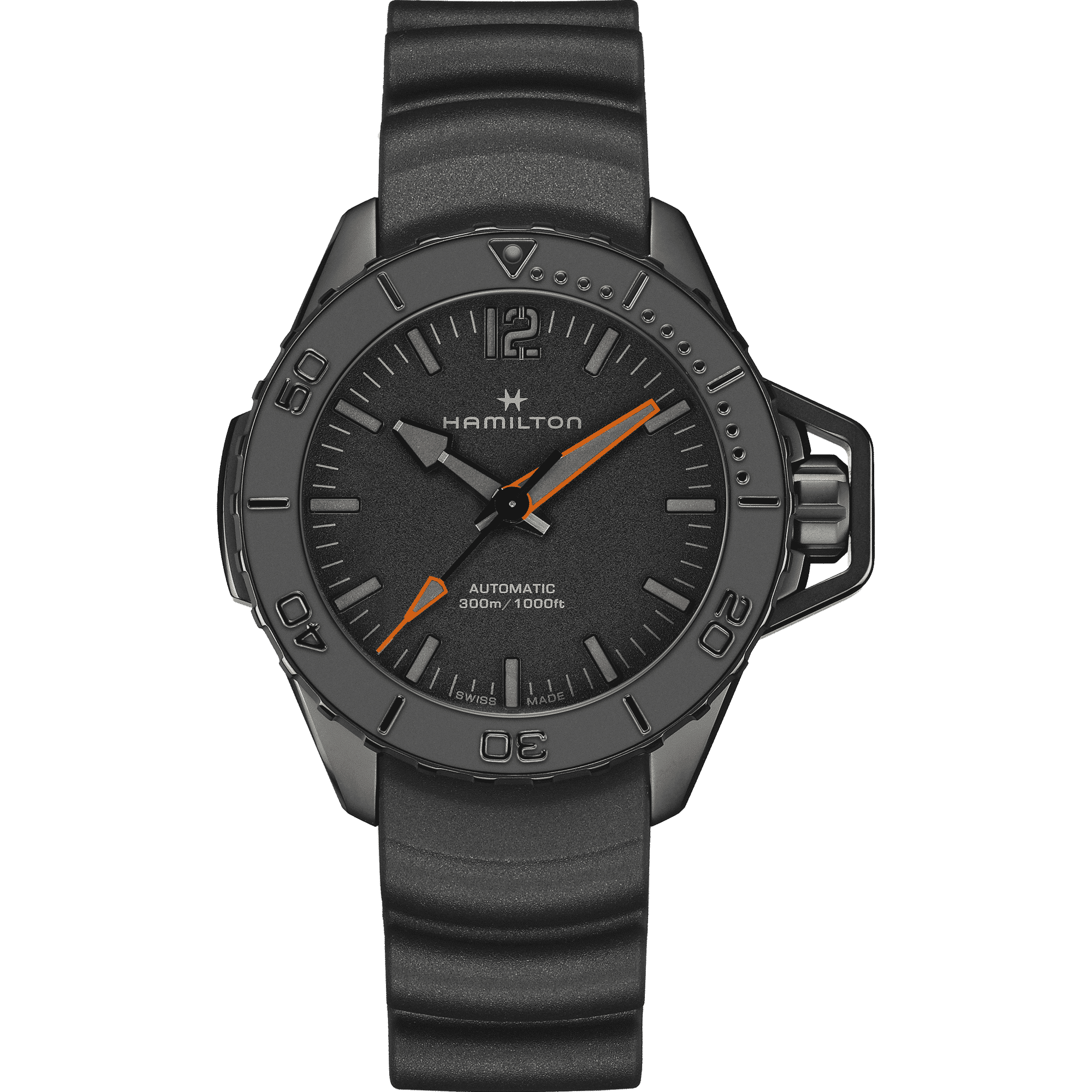 Con un nuovo look audace, il Khaki Navy Frogman Automatic è l’orologio Hamilton tecnicamente migliore per le avventure in mare. Progettato per garantire precisione, leggibilità e resistenza, porta l’insondabile potenza dell’oceano al polso. È inoltre dotato di una protezione della corona dalla forma unica, e di un cinturino in caucciù ondulato.