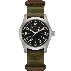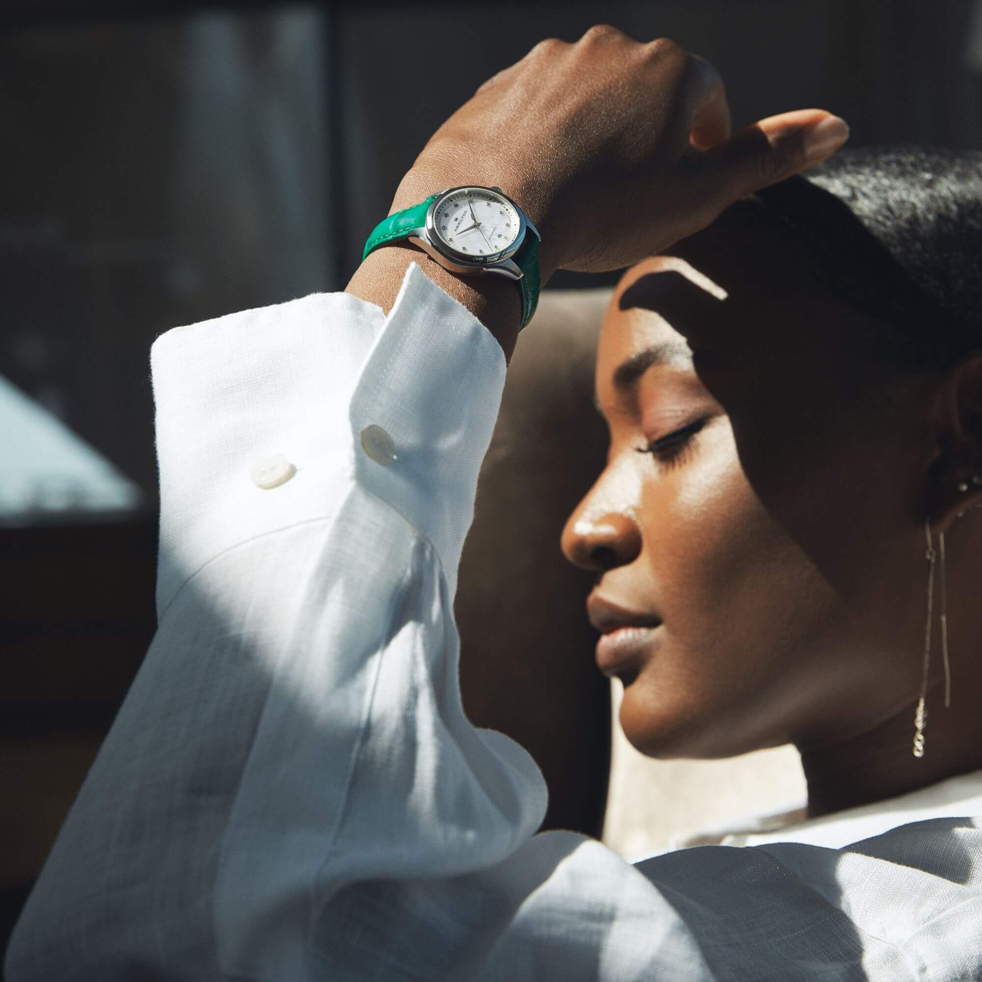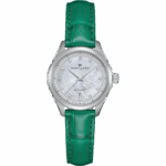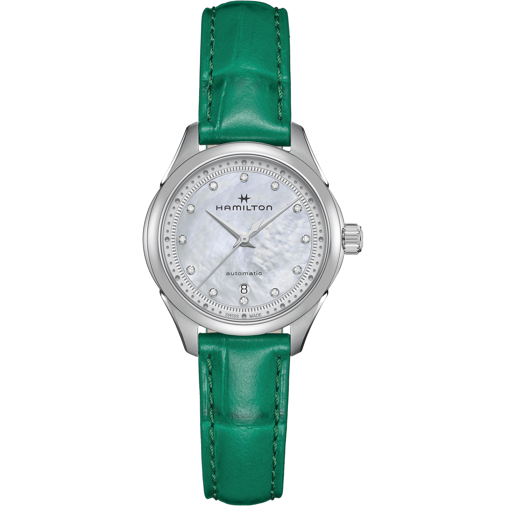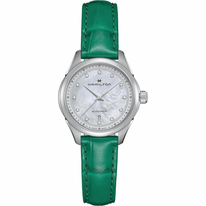 L’elegante cinturino in pelle verde con finitura in alligatore ed il quadrante in madreperla con indici in diamanti, sono gli elementi distintivi di questo Jazzmaster Lady Auto. Il movimento automatico con 44 ore di riserva di carica, racchiuso nella cassa da 30 mm, è sinonimo di precisione ed affidabilità.