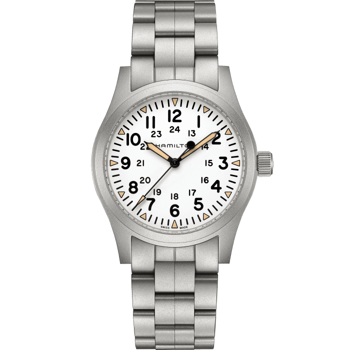 Uno dei segnatempo più iconici di Hamilton è ora disponibile con una cassa più grande. Animato dall’esclusivo movimento a carica manuale H-50, il Khaki Field Mechanical 42 mm conserva la forma originale con una cassa in acciaio con finitura sabbiata e quadrante facilmente leggibile in bianco o nero. Abbinata ad un comodo bracciale in acciaio o ad un cinturino NATO in tessuto verde, questa versione rivisitata di un orologio militare dal design robusto e resistente non ti farà perdere nessuna avventura.Scopri la nostra collezione di estilo militar