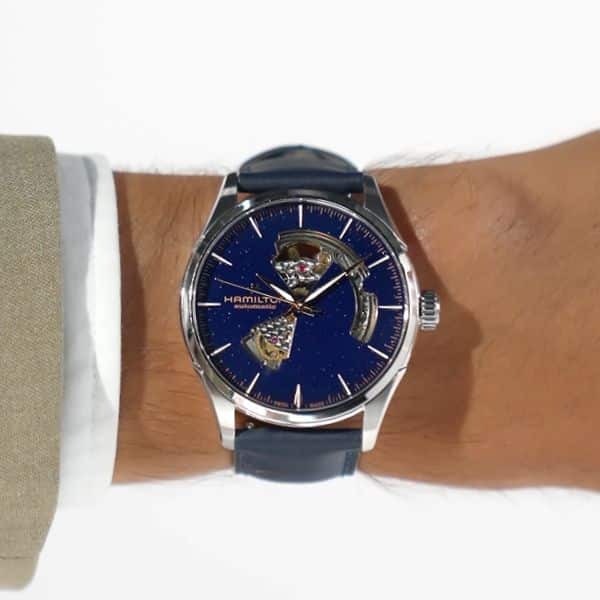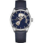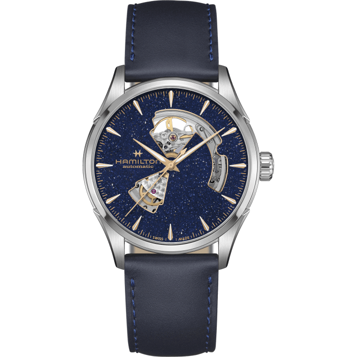 Il Jazzmaster Open Heart, con un design che rivela il suo potente movimento meccanico interno, punta tutto sulla precisione con un nuovo quadrante da 42 mm. Caratterizzato da un affascinante quadrante blu notte scintillante, questo straordinario segnatempo unisce la modernità dell’architettura urbana e l’infinità del cosmo. Incarnando il savoir-faire in continua evoluzione di Hamilton e l’attenzione ai dettagli, il quadrante mette in risalto il movimento automatico H-10. Con una riserva di carica di 80 ore e spirale in Nivachron™, il Jazzmaster Open Heart Auto vanta un elegante cinturino in pelle blu.