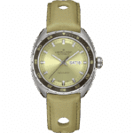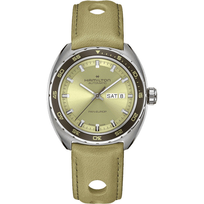 Fai un tuffo nel passato con questo Pan Europ Automatic da 42 mm dal design d’ispirazione vintage anni ‘60. In uno stile retrò che ben si adatta alla vita odierna, questo orologio presenta una cassa in acciaio a forma di cuscino con una lunetta girevole unidirezionale. Dotato del movimento automatico H-30 con una riserva di carica di 80 ore, il Pan Europ Automatic è il perfetto alleato per vincere la corsa contro il tempo. A completare il look, due cinturini intercambiabili: uno in tessuto intrecciato NATO marrone cioccolato e uno in morbida pelle traforata verde salvia, che richiama l’atmosfera delle corse automobilistiche degli anni ‘60.