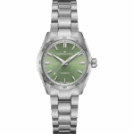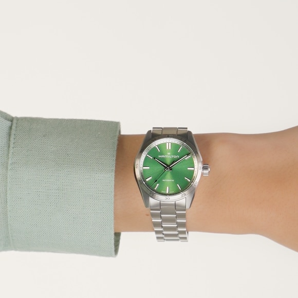 Pensata per chi ama in egual misura funzionalità e stile, la linea Jazzmaster Performer offre una potente estetica sporty-chic. Animato dal movimento automatico H-10 con riserva di carica fino a 80 ore, questo Jazzmaster Performer Automatic presenta una cassa in acciaio da 34 mm messa in risalto da un quadrante verde pistacchio, indici in nichel e un raffinato bracciale in acciaio.