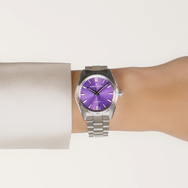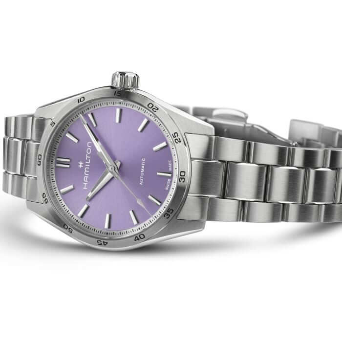 Pensata per chi ama in egual misura funzionalità e stile, la linea Jazzmaster Performer offre una potente estetica sporty-chic. Animato dal movimento automatico H-10 con riserva di carica fino a 80 ore, il Jazzmaster Performer Automatic presenta una cassa in acciaio da 34 mm messa in risalto da un quadrante lavanda chiaro, indici in nichel e un raffinato bracciale in acciaio.