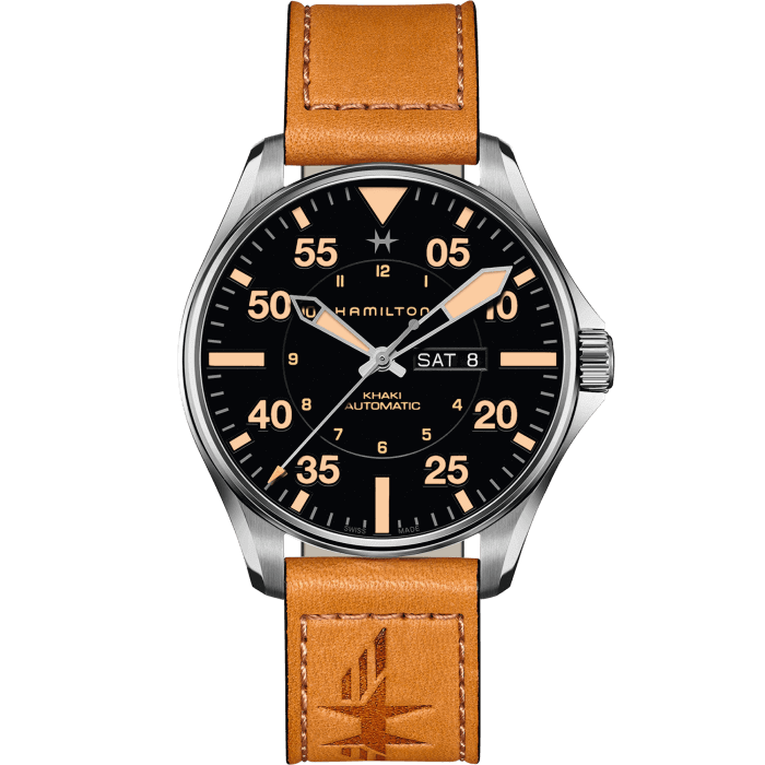 Questo orologio della dimensione di 46 mm è perfetto al polso di un pilota o di un aviatore urbano. Presenta una pratica funzione giorno e data, lancette e indici ultra leggibili in SuperLumiNova® e l’esclusivo movimento automatico H-30 che offre fino a 80 ore di riserva di carica. Nessun limite è insuperabile per questo orologio aeronautico dal carattere spiccatamente Hamilton.