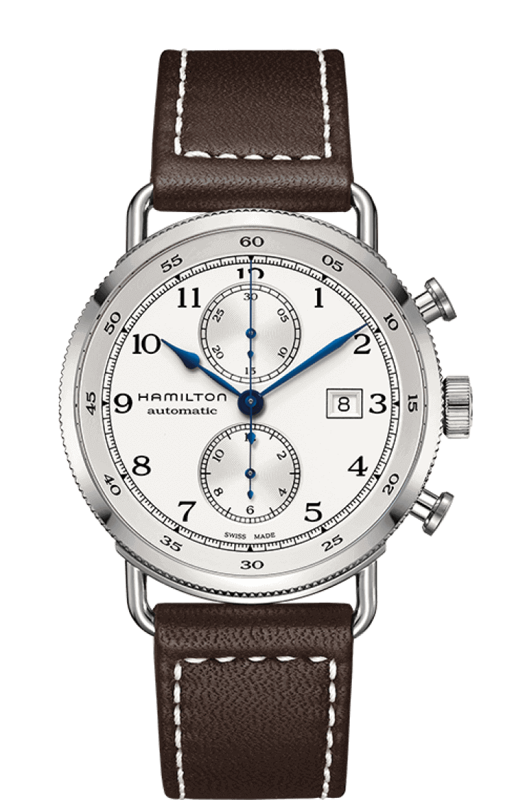 Questo orologio classico finemente lavorato si ispira ai cronometri da marina prodotti da Hamilton negli anni '40. Il modernissimo movimento H-21 fornisce al segnatempo 60 ore di riserva di carica. Le lancette blu fiammante sono il segno della lunga tradizione orologiera del marchio.