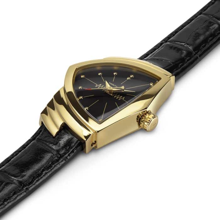 Il Ventura originale, presentato nel 1957, passò alla storia dell’orologeria come il primo orologio elettrico a batteria al mondo. Con il suo design unico e audace, divenne rapidamente un’icona e un oggetto da collezione. L’ultima interpretazione del Ventura è un fedele tributo all’originale e richiama la pionieristica forma a scudo della cassa, esempio di design moderno “Mid-Century”.