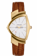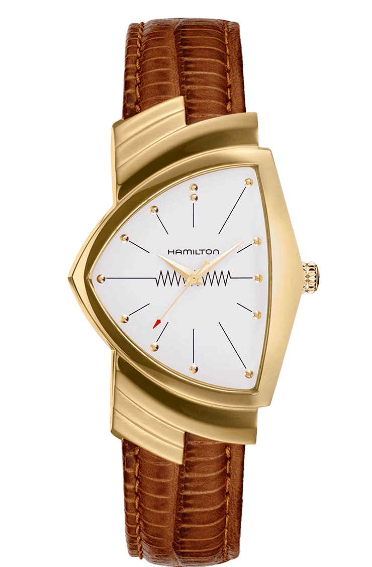 Il Ventura originale, presentato nel 1957, passò alla storia dell’orologeria come il primo orologio elettrico a batteria al mondo. Con il suo design unico e audace, divenne rapidamente un’icona e un oggetto da collezione. L’ultima interpretazione del Ventura è un fedele tributo all’originale e richiama la pionieristica forma a scudo della cassa, esempio di design moderno “Mid-Century”.